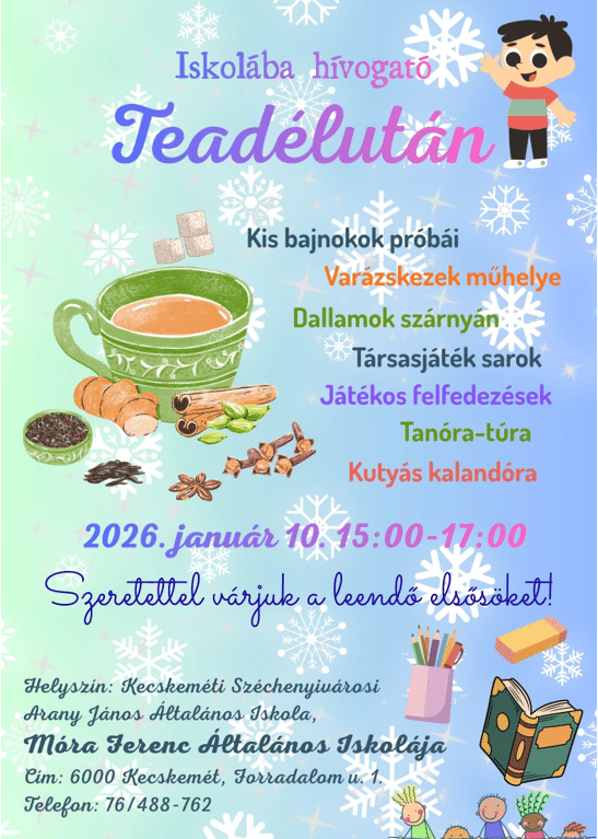 A Kecskeméti Móra Ferenc Általános Iskola szeretettel várja a leendő első osztályosokat és szüleiket egy vidám iskolába hívogató teadélutánra.