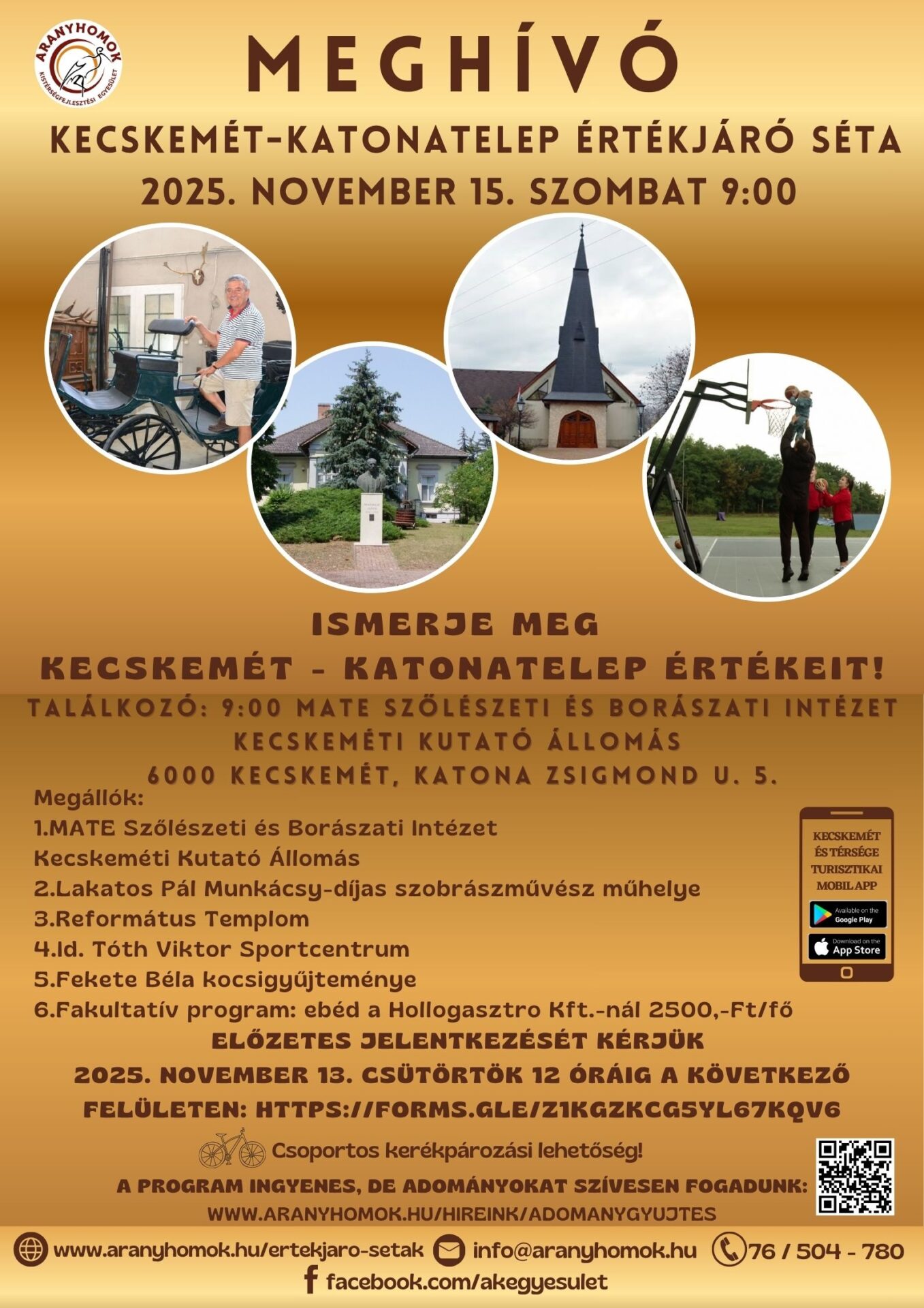 A programokon a részvétel ingyenes, de adományokat szívesen fogadunk: https://www.aranyhomok.hu/hireink/adomanygyujtes Célunk Kecskemét és térsége települési értéktárainak megismertetése, népszerűsítése.