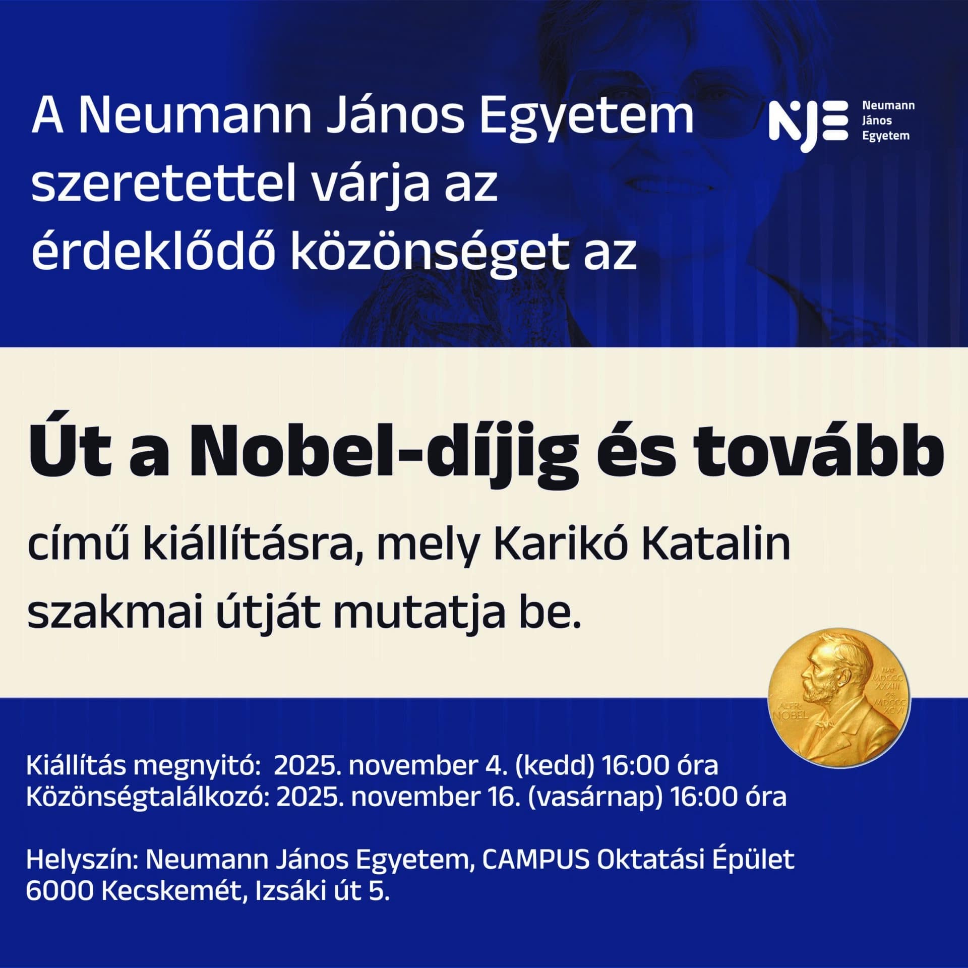 Az MTA 200 éves jubileuma alkalmából a dél-alföldi régió ünnepi nyitórendezvényét november 4-én tartották Kecskeméten, ahol az MTA Szegedi Akadémiai Bizottsága, a régió iparkamarái és a Neumann János Egyetem közösen köszöntötték a magyar tudomány kétszáz éves örökségét. Az eseményt innovatív díjátadók, tudományos előadások és egy különleges kiállítás kísérte, amely Karikó Katalin Nobel-díjas kutató életútját mutatja be. A „Karikó Katalin útja a Nobel-díjig és tovább” című tárlat a Neumann János Egyetem campusán tekinthető meg, és november 16-án, vasárnap 16 órakor különleges eseménnyel teljesedik ki amikor a világhírű kutató ellátogat az egyetemre. A látogatás idején sor kerül egy nyilvános beszélgetésre és a kutató könyvének dedikálására is. A rendezvény iránt érdeklődőknek regisztrálniuk kell az egyetem honlapján. https://forms.cloud.microsoft/e/kJe4tYx5MM