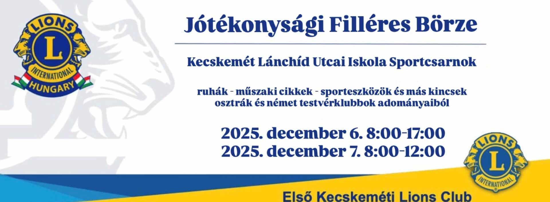 Az Első Kecskeméti Lions Club közel három és fél évtizede szervezi meg karácsony közeledtével a Filléres Börzét. A Lánchíd Utcai Általános Iskola sportcsarnoka ilyenkor megtelik emberekkel, akik ruhák, lakás-textíliák, műszaki cikkek, lakás felszerelési tárgyak, dísztárgyak, játékok, sportfelszerelések közül válogathatnak, melyek az osztrák és német testvér klubok adományaiból gyűltek össze. Ehhez jönnek még a magyar klubtagok gyűjtéséből is árucikkek. A börze kínálatát az őszi hónapok folyamán hozzák be, raktározzák a város jóvoltából. Klubtagok, diákok, önkéntesek segítségével az eseményt megelőző pénteken kipakolnak a sportcsarnokban, majd szombat-vasárnap hatalmas kínálattal várják az érdeklődőket.