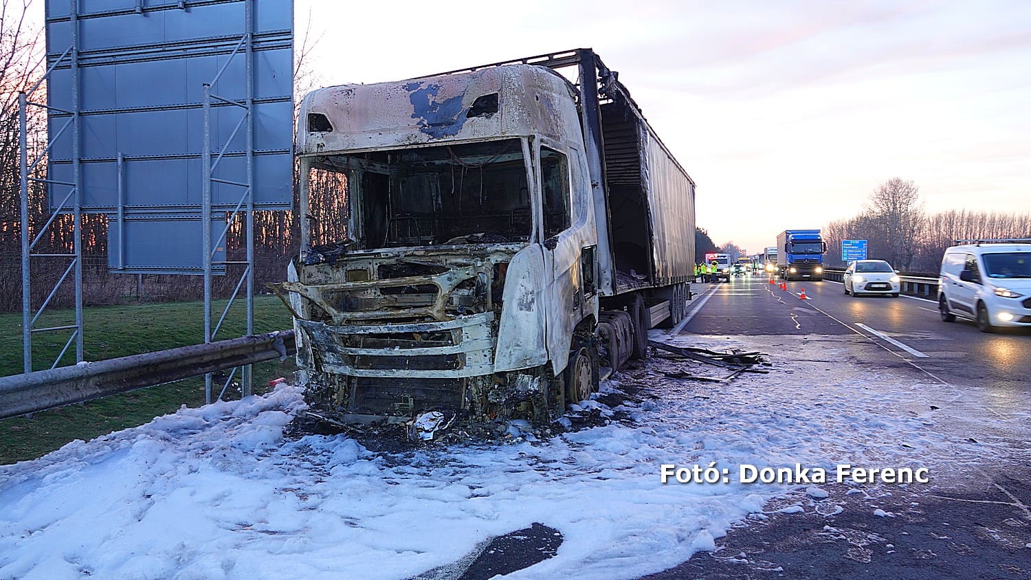 A lengyel kamion Budapest irányába haladt, amikor információnk szerint kigyulladt a motortere. A benne egyedül ülő sofőr porral oltóval próbálta megfékezni a tüzet és közben értesítette a