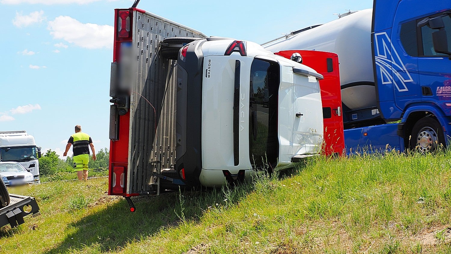 A kisteherautó traktor része egy szállított kocsival leszakadt és a sztrádán keresztben, oldalára borult, a tréler pedig az árokban állt meg, a rajta szállított két gépkocsival. A kamion kartonpapírokat szállított, ami a helyszínelés után tovább tudott menni, a balesetben egyik sofőr sem sérült meg.