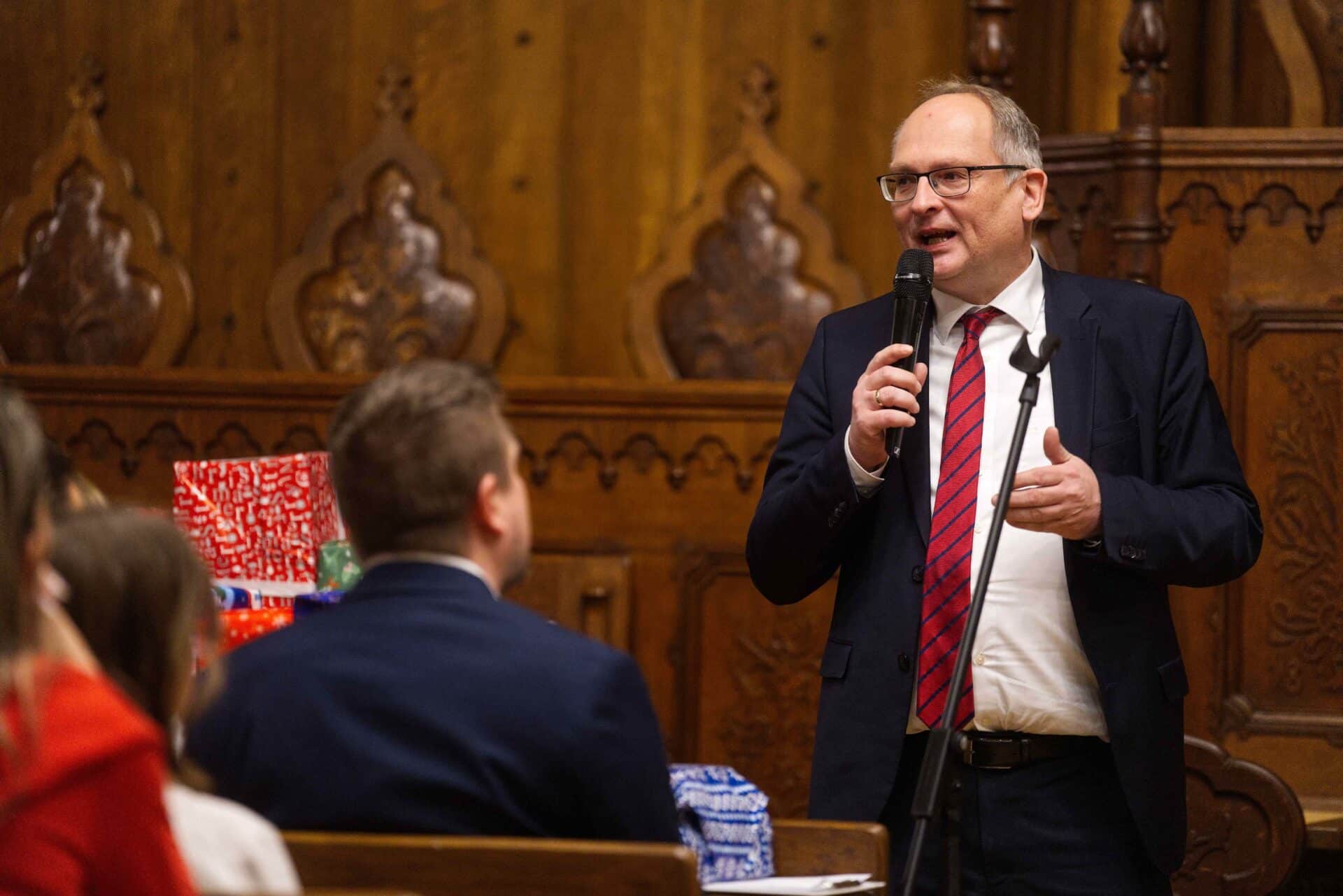 Peter Stübler, az iskola igazgatója is megosztotta ünnepi gondolatait a jelenlévőkkel. Kiemelte, német iskolaként nem szeretnének elszigetelten működni. Fontosnak tartják, hogy a kecskeméti közösségi élet részesei legyenek, ezért is rendezik meg ezt a jótékonysági akciót immár 13 éve. Az igazgató külön köszönetet mondott Sebők-Vakulya Gizellának, a szülői munkaközösség vezetőjének, aki összefogta, koordinálta a programot.