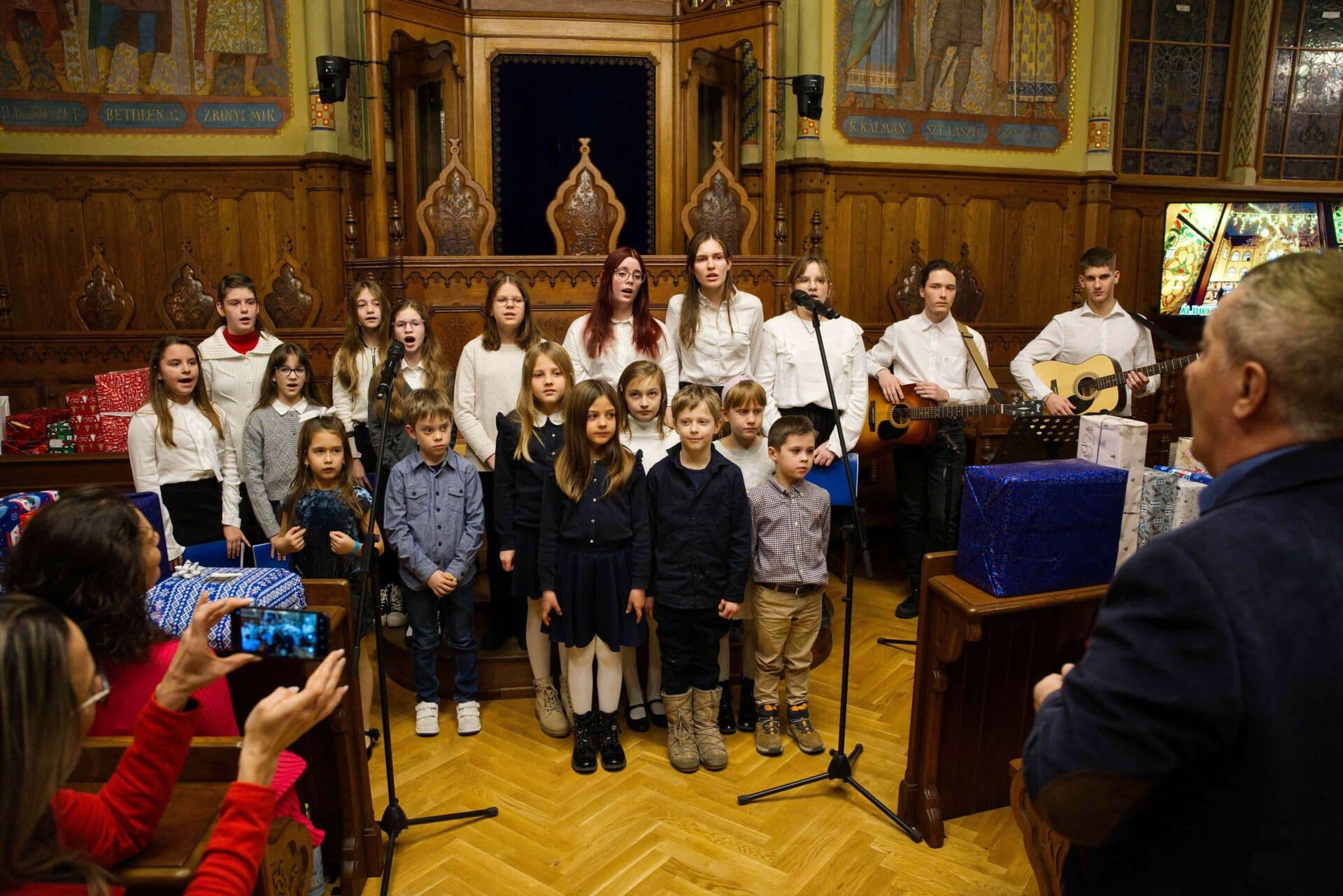 A Mercedes-Benz Iskola énekkara lépett fel szerda délután a Városháza dísztermében, ahol 13. alkalommal rendezték meg Karácsonyi a cipősdobozban akciójuk átadó ünnepségét. Idén 130 rászoruló gyermek karácsonyát tették szebbé a csomagokkal, nagy szeretettel töltötték meg játékokkal, édességekkel, sok-sok meglepetéssel.