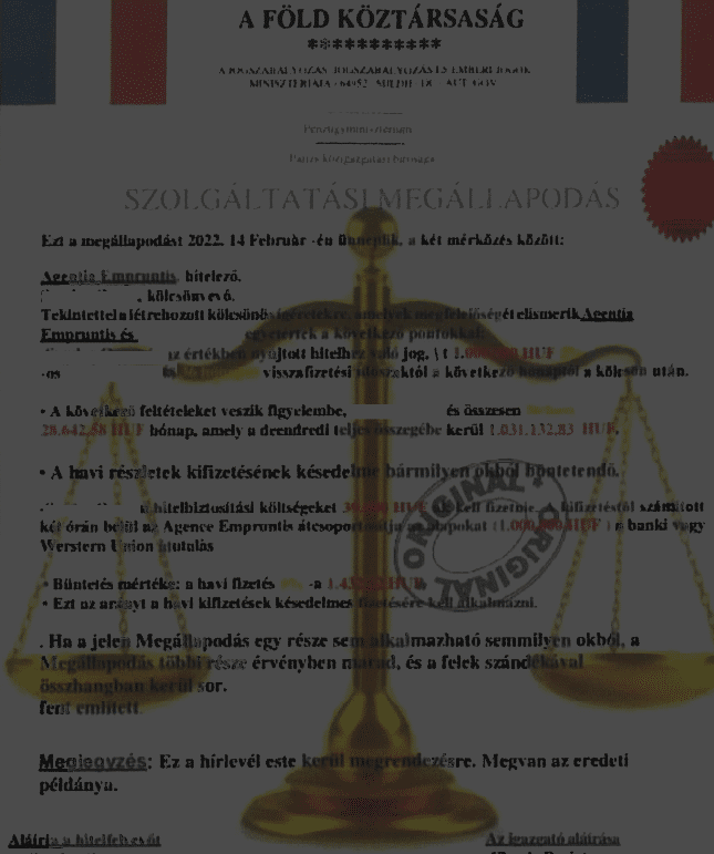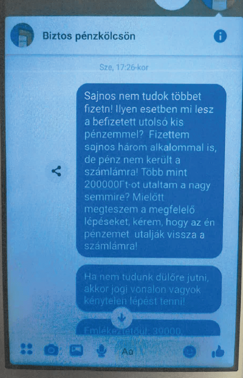 (A csatolt fotókon a kölcsönt ígérő ismeretlen személy által a károsultakkal folytatott üzenetváltások és egy „kölcsönszerződés” látható.)