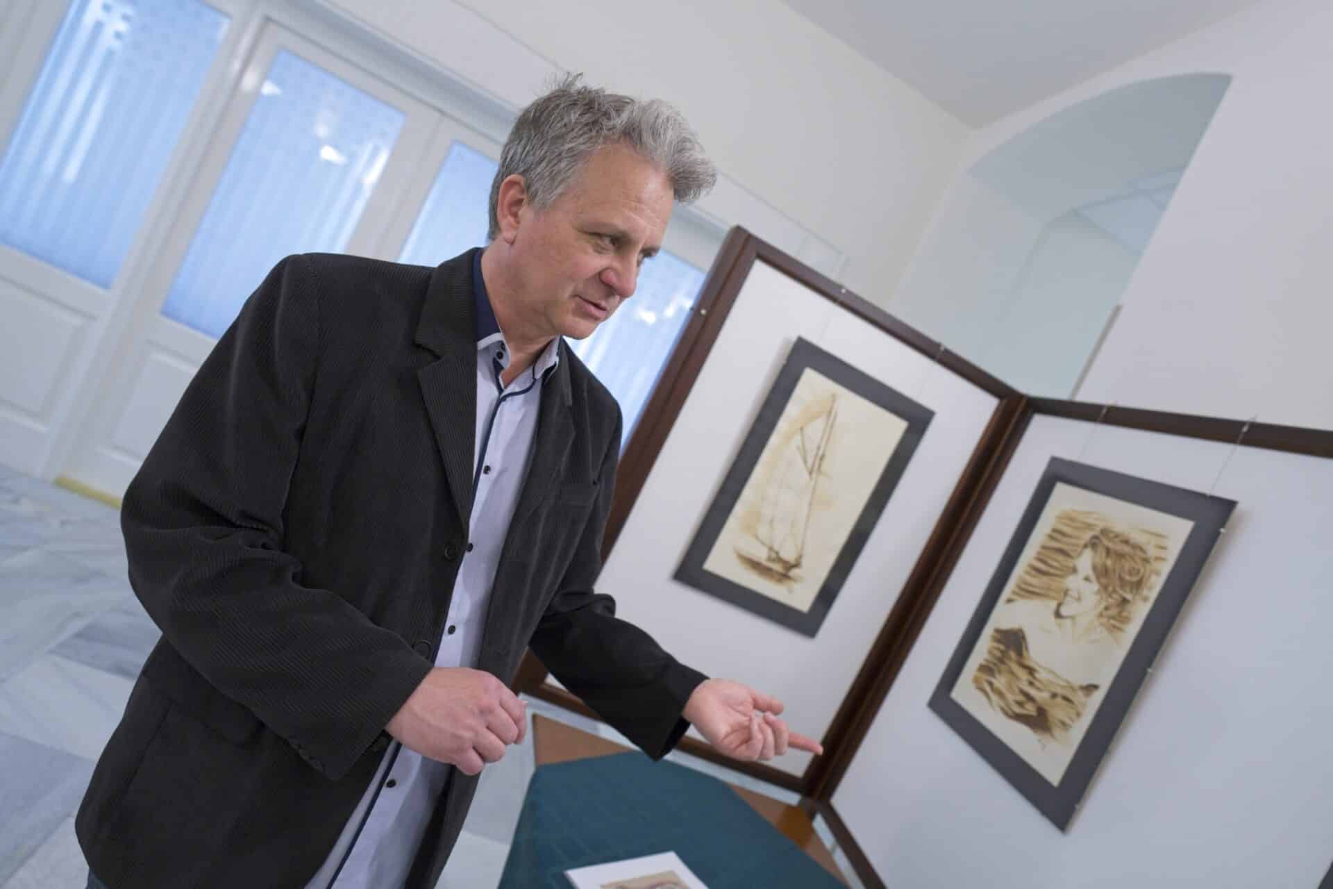 Kávézzunk másképpen! – invitálja közönségét Prém Szabolcs, aki kávéval fest. A különleges technika a kávéivás rituáléjával fonódik össze – ennek kapcsán olvasott föl egy képzelt történetet Varga Mónika a tegnap délutáni eseményen.
