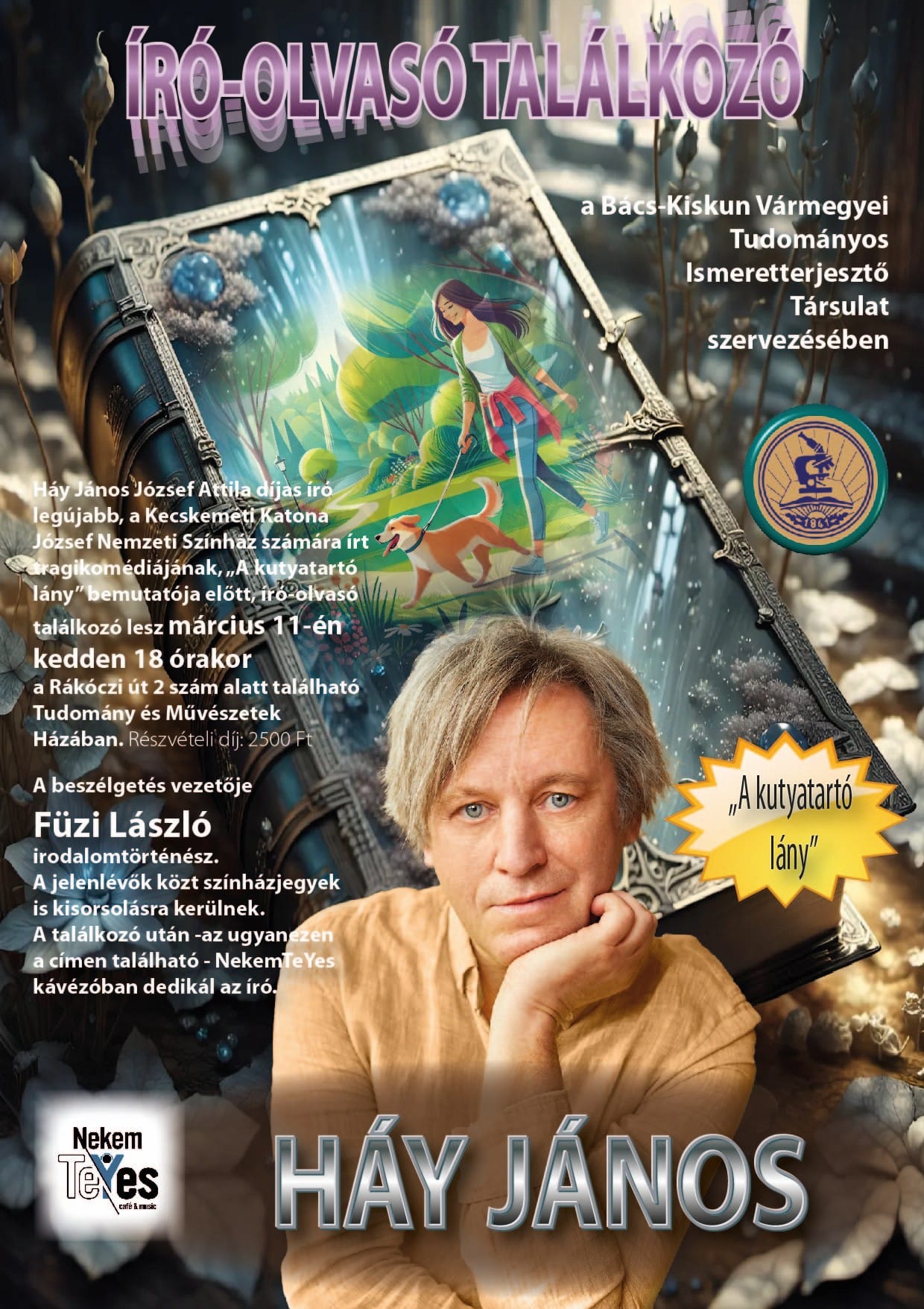 Háy János legújabb, külön a Kecskeméti Katona József Nemzeti Színház számára írt tragikomédiájának bemutatása előtt író-olvasó találkozó lesz március 11-én, kedden 18 órakor a Rákóczi út 2. szám alatt található Tudomány és Művészetek Házában. ( A jelenlévők között színházjegyek is sorsolásra kerülnek.) A találkozó után – az ugyanezen a címen található – NekemTeYes kávézóban dedikál az író.