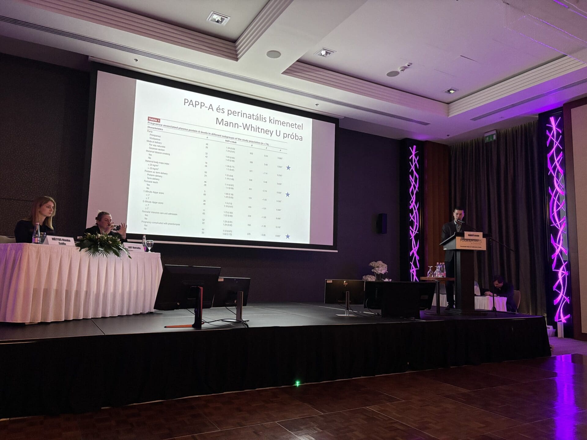 Dr. Dankó István PhD szülész-nőgyógyász szakorvos, endokrinológus előadása a várandósság korai szakaszában végzett laboratóriumi vizsgálatok klinikai jelentőségére fókuszált. „Klinikopatológiai összefüggések az első trimeszter végén meghatározott anyai PAPP-A érték és a perinatális kimenetel, illetve placenta szövettan között” című előadásában a placenta működésének és a terhességi kimenetelek kapcsolatát elemezte. A kutatás rámutat arra, hogy az első trimeszterben meghatározott biomarkerek fontos információt hordozhatnak a várandósság későbbi alakulásáról, így hozzájárulhatnak a magasabb kockázatú terhességek korai azonosításához és a személyre szabott gondozáshoz.