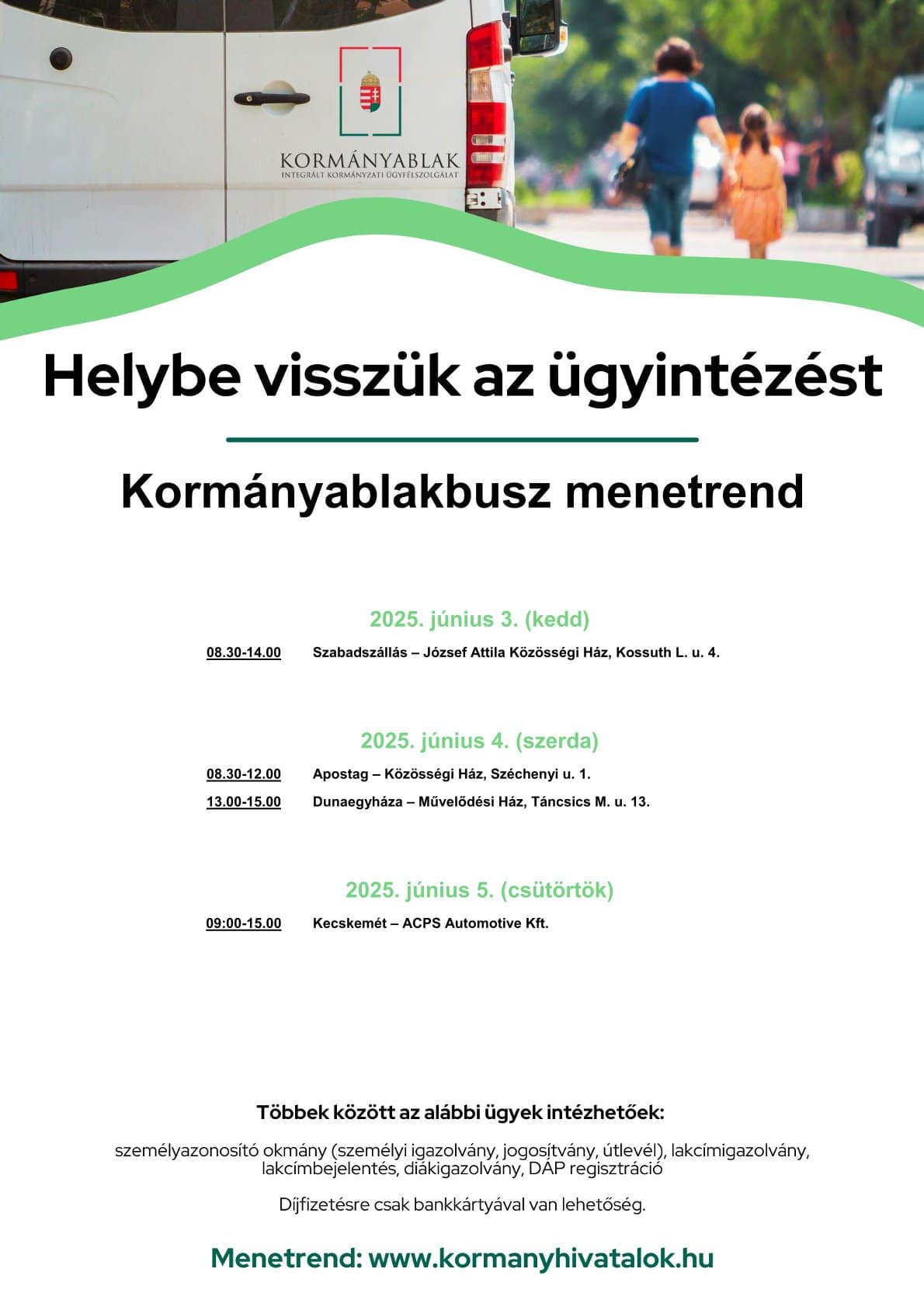 Az elkészült okmányok átvételére a buszon – technikai okok miatt – nem lesz lehetőség. A bankkártyás fizetés a mobilizált ügyfélszolgálaton is biztosított.
