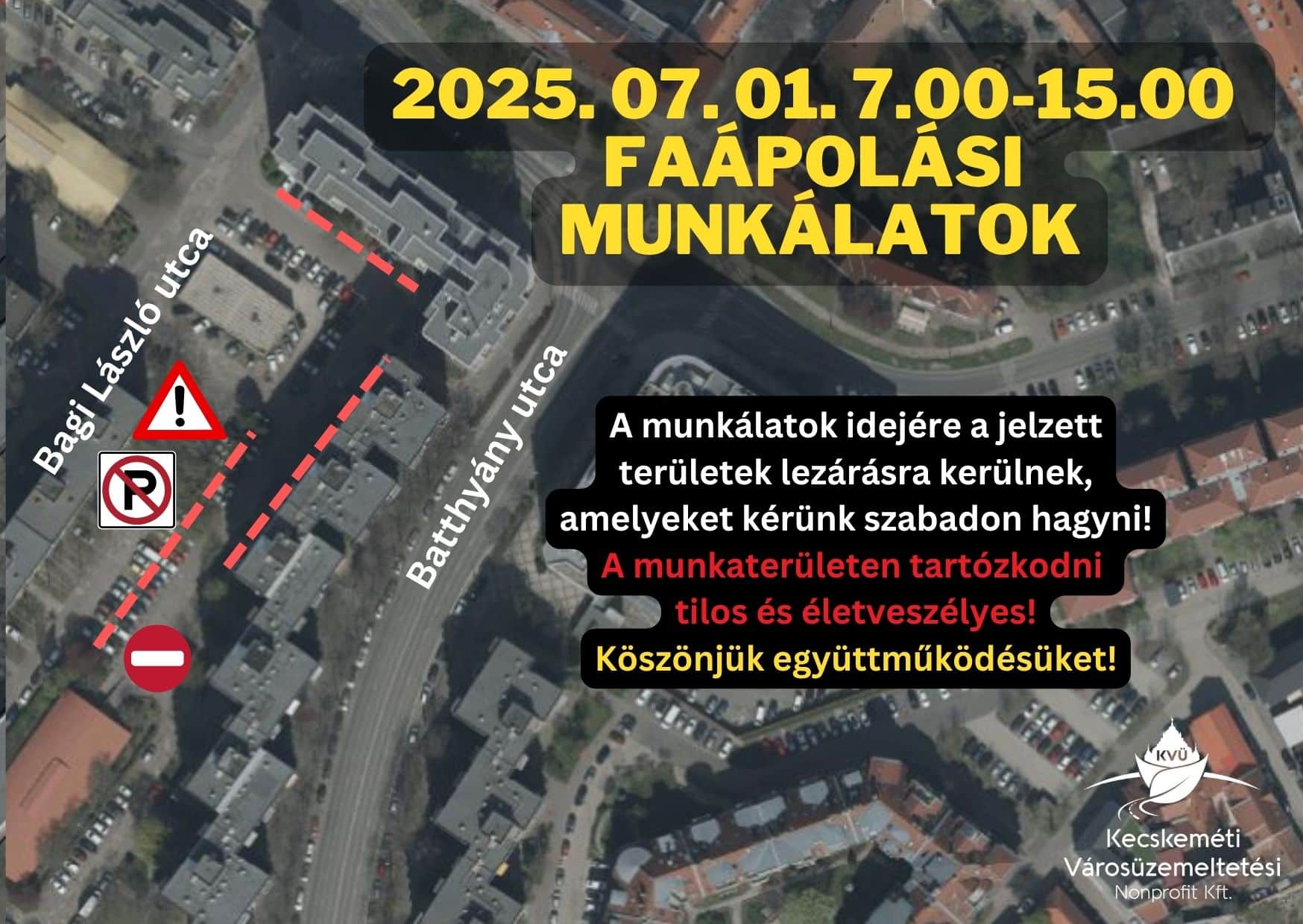 A Kecskeméti Városüzemeltetési Kft. tájékoztatása szerint július elsején faápolás munka zajlik majd a Batthyány utcai parkolókban. Részletek az alábbi tájékoztatóban.