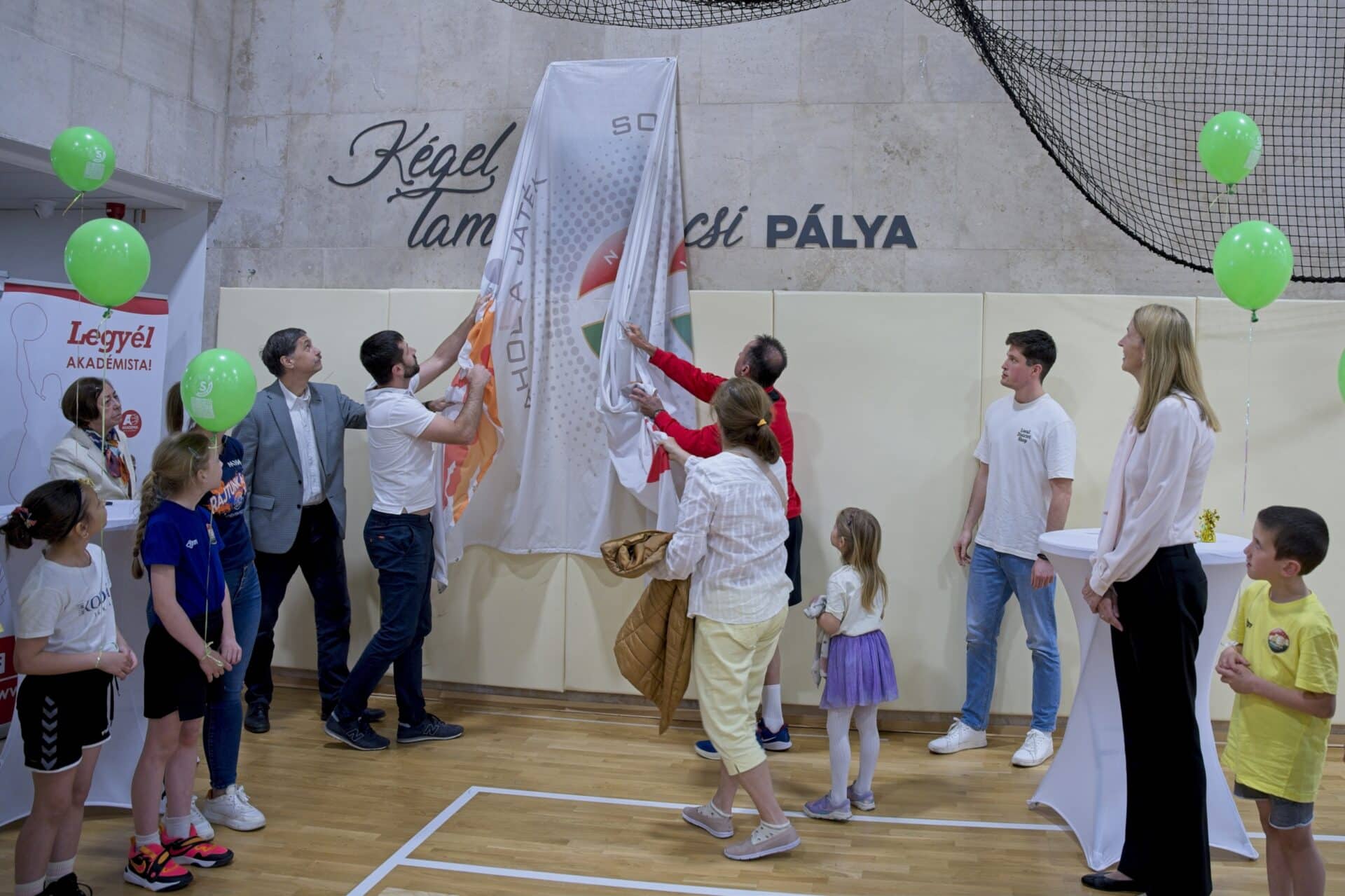 A köszöntők után leleplezték a "Kégel Tamás Bácsi pálya" feliratot az akadémia bal oldalsó pályájának falán a család és a szakma képviselőinek jelenlétében.