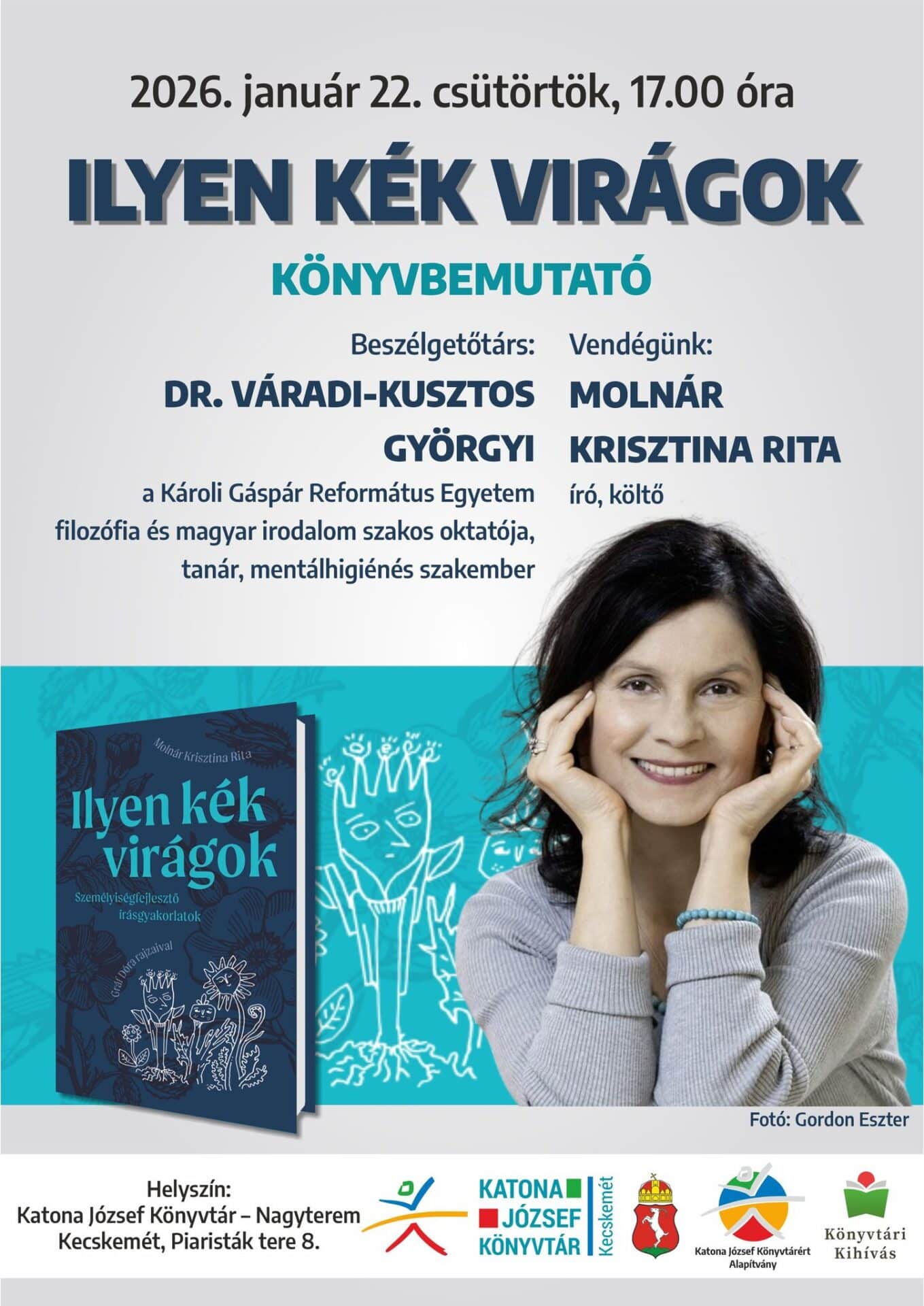 Január 22-én, azaz a magyar kultúra napján könyvbemutatóval várja vendégeit a Katona József Könyvtár. Az ünnepi vendég Molnár Krisztina Rita író, költő lesz, akinek Ilyen kék virágok című, személyiségfejlesztő írásgyakorlatokat tartalmazó kötetét ismerhetik meg közelebbről az érdeklődők.