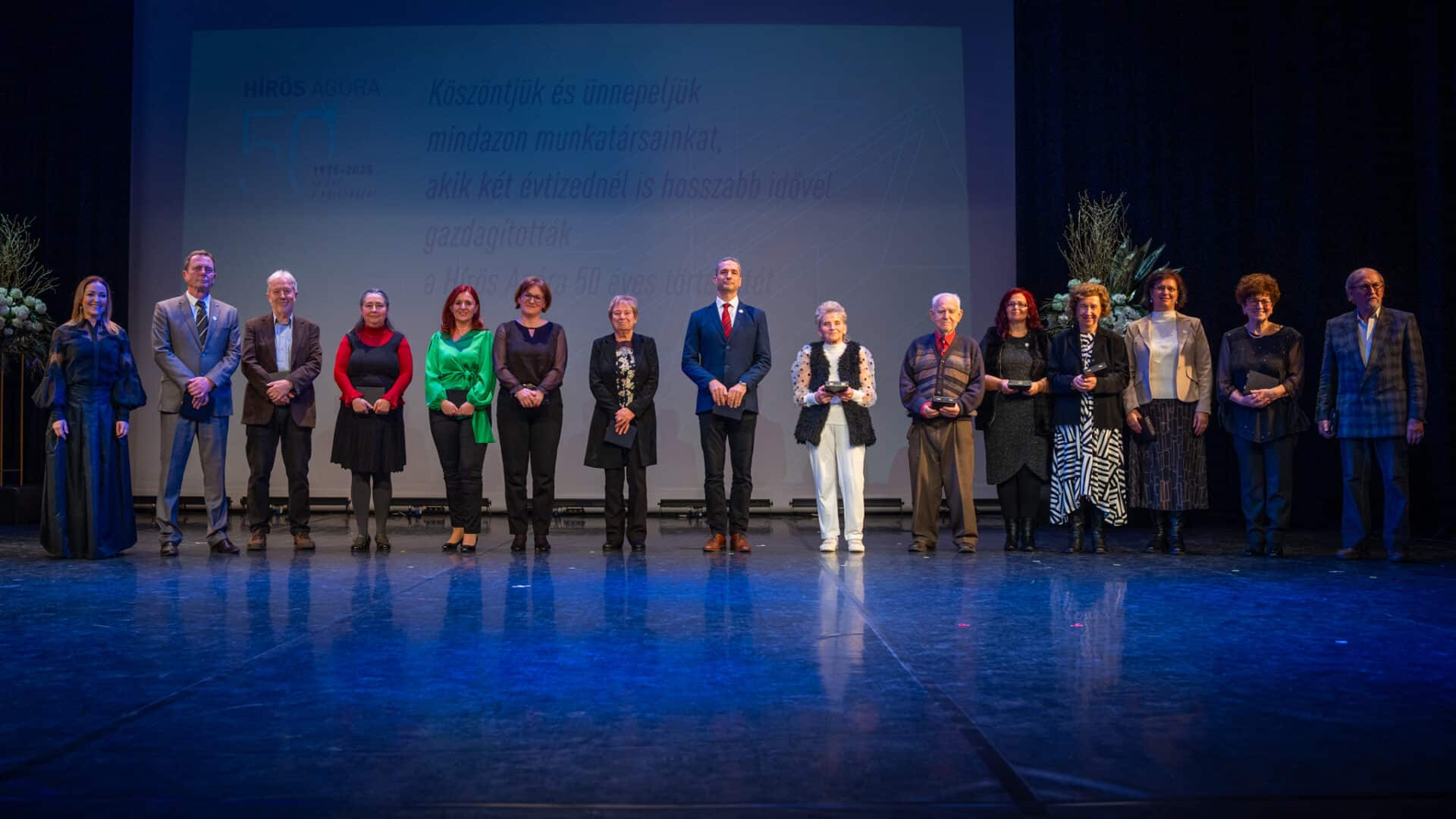 HA50 Gálán elismerésben részesítettük azokat a kollégákat, akik több mint 20 éven át dolgoztak az intézményben, köztük olyanokat is, akik ma már nyugdíjasként viszik tovább a Hírös Agóra emlékeit és szellemiségét. Kitartásuk, szakmai megbízhatóságuk és közösségformáló jelenlétük a Hírös Agóra történetének része: