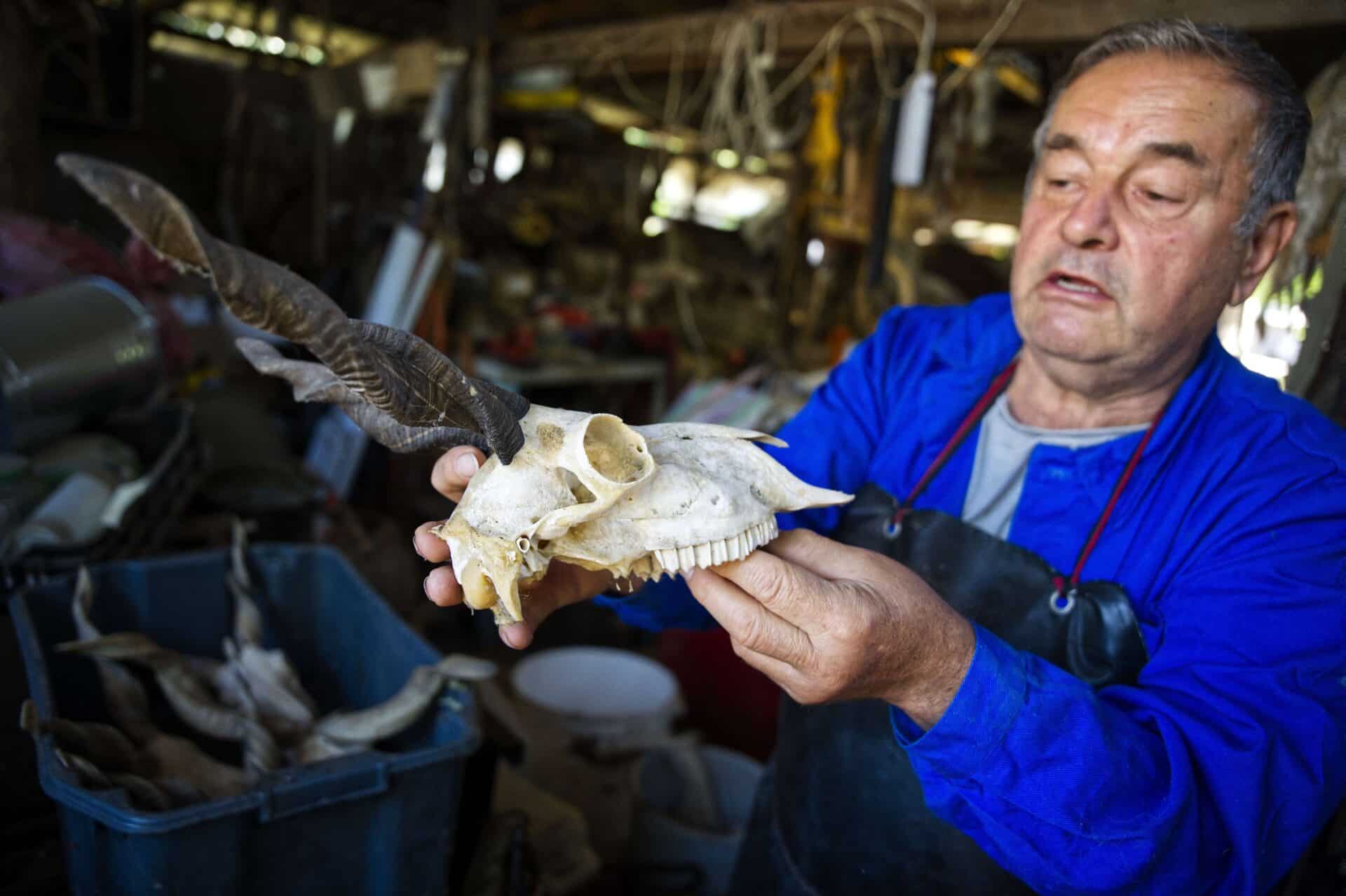 És persze rendszeresen dolgozik marhabőrrel, birkabőrrel, kecskével. A racka bőre az egyik legjobb, a marhabőr pedig főként szíjakhoz, lószerszámokhoz való. Nyers állapotban a legerősebb, akár évekig bírja. A sámándobok is népszerűek manapság, azokhoz finomabb anyag szükséges, ezt cserzetlen borjúbőrből készíti. Ahogy haladunk, hordóban egy kosfej fürdik az oldatban, "ezt majd le fogom főzni", tovább lépve egy muflon herezacskó és kostökzacskó ázik – "megtömöm fűrészporral és akkor lehet belőle pipazacskó" – tájékoztat.