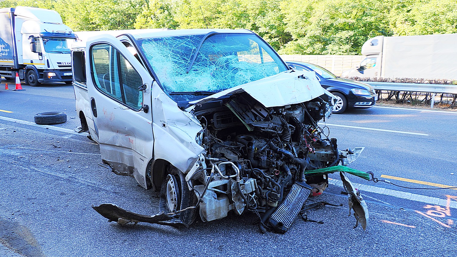 A kisbusz hat személlyel Budapest irányából haladt, amikor egy sávterelés miatt áthajtott a szemközti sávba, majd az útszéli szalagkorlátnak csapódott, amit szétszakított. A hatalmas erejű ütközéstől a kisbusz ajtaja leszakadt, a benne ülő munkások hiába kapaszkodtak, két ember kirepült.