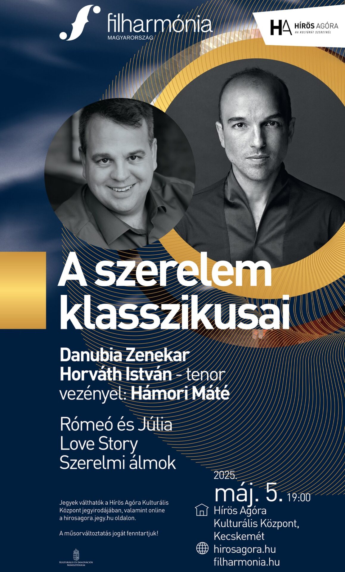 A Filharmónia Magyarország kecskeméti koncertsorozata, a Kodály-bérlet utolsó alkalmát május 5-án 19 órai kezdettel rendezik meg. A Hírös Agóra színháztermében a Hámori Máté vezette Danubia Zenekar lép majd fel. A fővárosi együttes Mozart, Liszt, Csajkovszkij, Glinka, Berlioz, Sosztakovics, Mancini és Ott Rezső műveit szólaltatja meg. Olyan dallamokat hallhat majd a nagyérdemű, melyekben a szerelem felemelő, melankolikus, drámai, érzelmes, hősies és intrikus oldala is feltűnik. Sőt, olyan darab is elhangzik, ami egymagában foglalja össze a szerelmes zenék és szerelmes számok történetét. Az est szólistája Horváth István, a Magyar Állami Operaház kamaraénekese lesz.