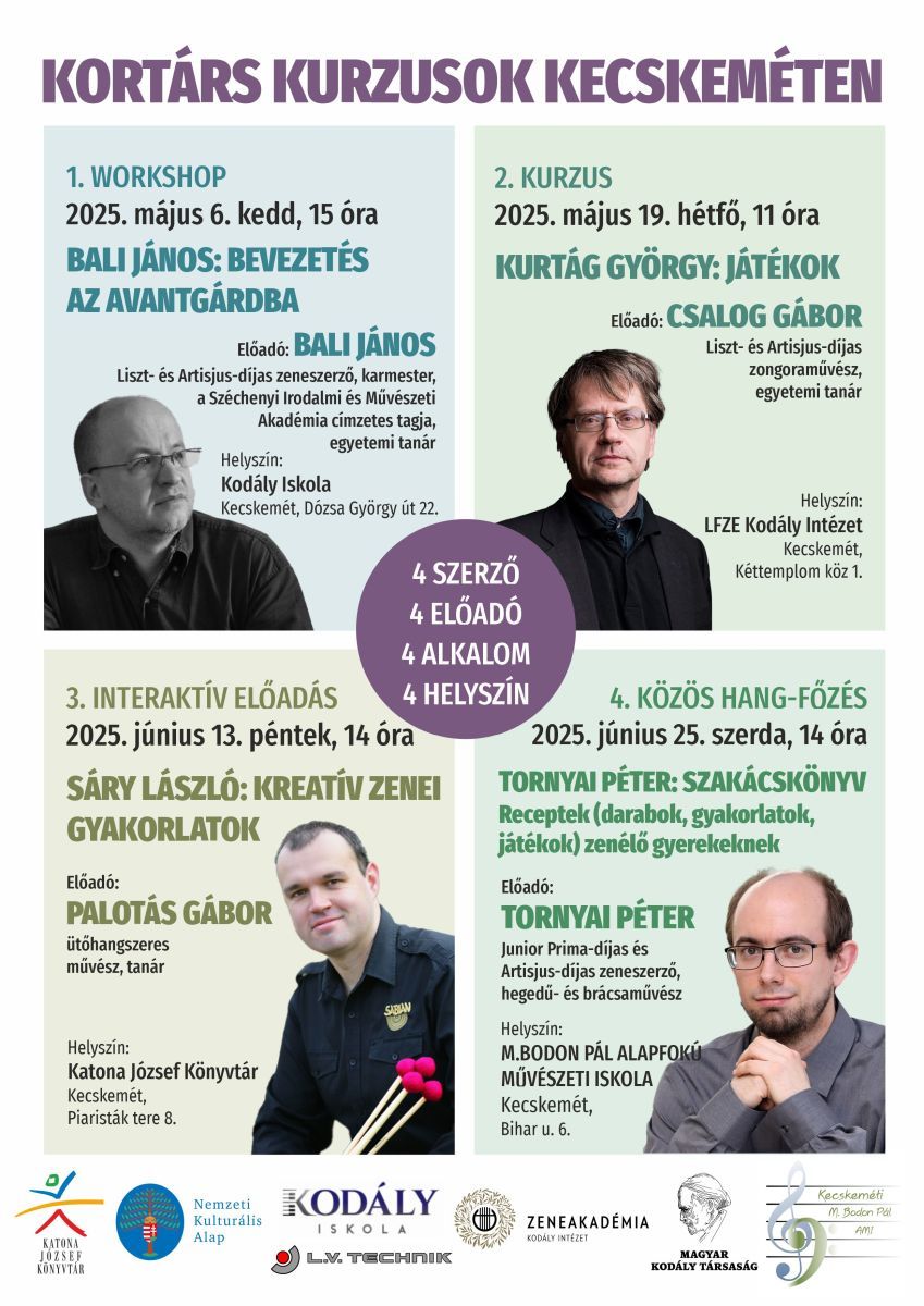 Május 6-án kortárszenei sorozatot indít a Magyar Kodály Társaság Kecskeméti Tagcsoportja. A tervek szerint négy programot négy előadóval, négy helyszínen tartanak majd. A négy zeneszerző pedagógiai munkásságára épülő interaktív előadásokra négy vendégművészt hívtak meg: Tornyai Péter és Bali János kiadványának bemutatójára magukat a szerzőket, Sáry László pedagógiai gyűjteményének ismertetésére Palotás Gábort, a Kodály Iskola ütőhangszeres művésztanárát, illetve a Kurtág-előadásra Csalog Gábor zongoraművészt, a kétszeres Kossuth- és háromszoros Erkel Ferenc-díjas magyar zeneszerző egyik leghitelesebb ismerőjét, tolmácsolóját. A szervezők mind a négy alkalmat játszani, zenélni szerető gyermekek, ifjú muzsikusok, valamint zenepedagógusok aktív bevonásával képzelik el. Bali János: Bevezetés az avantgardba című workshopja május 6-án, 15 órakor kezdődik a Kodály Iskolában, Csalog Gábor: Kurtág György Játékok című sorozatáról május 19-én, 11 órától a Kodály Intézetben beszél majd, míg a további két alkalmat júniusban rendezik meg.