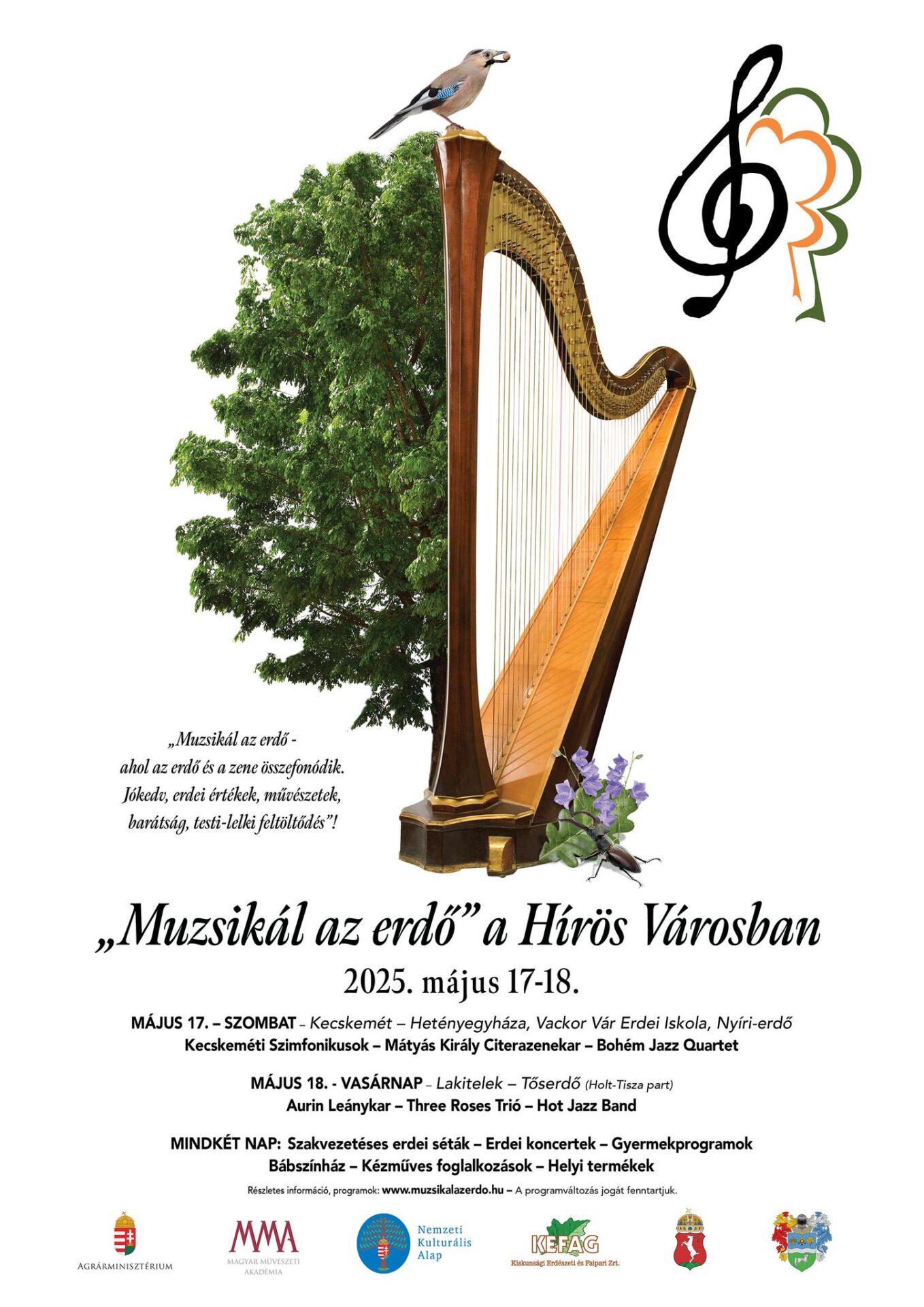 Május derekán ismét „Muzsikál az erdő” a hírös városban. 17-én Hetényegyházán, a Nyíri-erdőben rendkívül színes programkavalkád várja az érdeklődőket. Gyerekfoglalkozásokat, állatbemutatókat, élménysétákat tartanak, az 1848–49-es múzeumot is meg lehet tekinteni, és persze lesznek zenés programok is. Így például 10:10-től a szilfakörben Szilágyi Áron vezeti a Leskowsky Hangszergyűjtemény bemutatóját, kora délután a kecskeméti szimfonikusok – ígéretük szerint – erdei hangulatot teremtenek, 16 órától a Mátyás Király Citerazenekar játékában is gyönyörködhetnek a népzene kedvelői, míg 17 órától a Bohém Jazz Quartet – Bolba Éva (ének), Bera Zsolt (harsona), Ittzés Tamás (zongora, ének) és Gulyás-Szabó Krisztián (dob) – játszik majd. Másnap Lakitelek-Tőserdőn folytatódik a rendezvény, ott többek között a Durányik László vezette Aurin Leánykar is fellép.