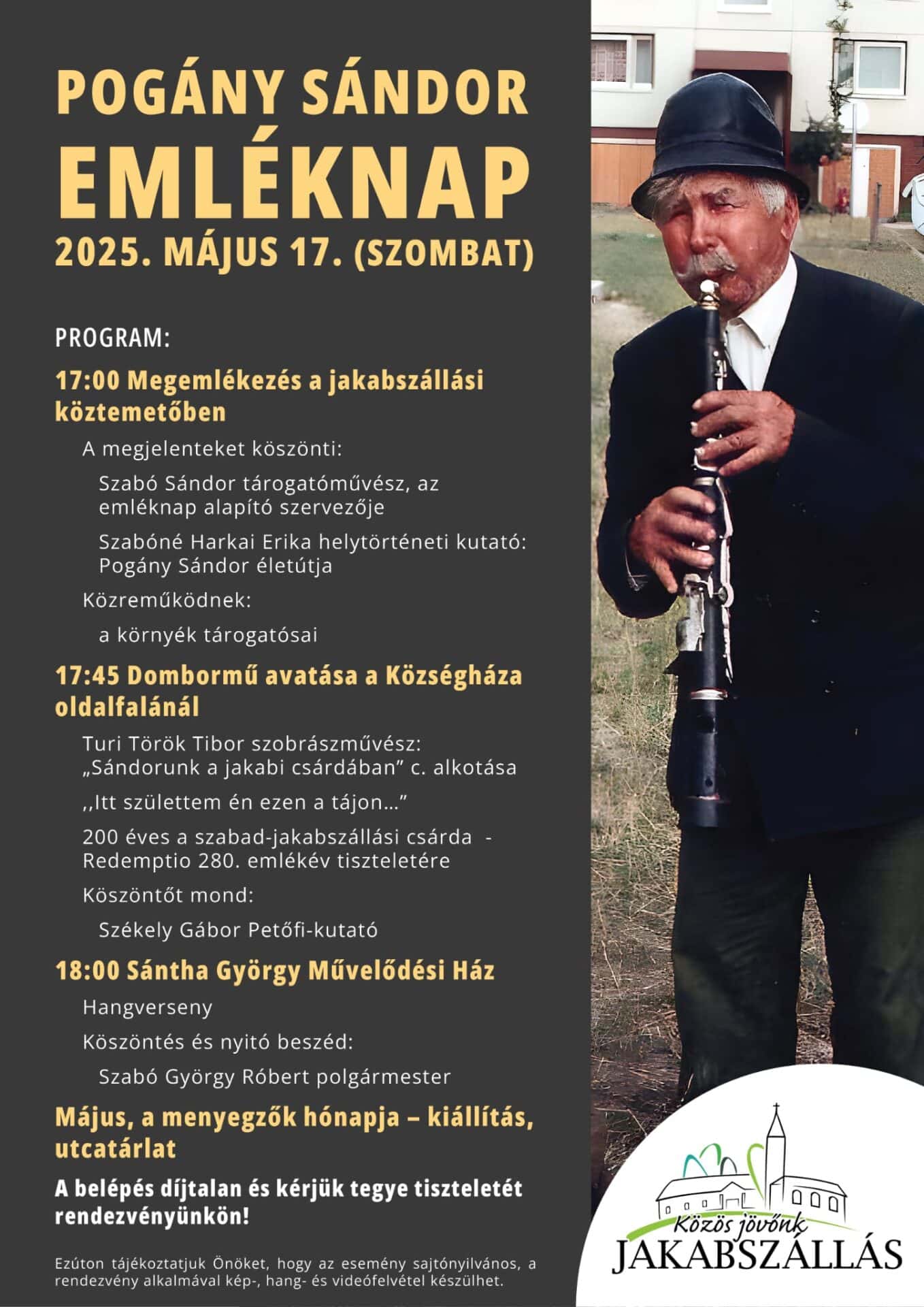 Május 17-én Jakabszálláson 17 órától immár másodszor rendeznek emléknapot Pogány Sándor tiszteletére. Az 1904-ben Kecskeméten született tárogatós gyakran játszott a hírös város utcáin. „Pikulás” bácsira – ahogyan ismerősei nevezték –, szívmelengető dallamaira a közösségi oldalak tanúsága szerint sokan gondolnak vissza jó szívvel. Az emléknapon, melynek programjait Szabó Sándor tárogatóművész szervezi, a környék, valamint Budapest, Pécs és Szajk 15 tárogatósa tiszteleg majd a zenész előd emléke előtt. A Kecskeméti Televízió korábbi főszerkesztője, nyugdíjas éveiben előadóművészként is igen aktív muzsikus vezette Gregus Tárogató Kvartett tagjai sem pihennek a következő hetekben, május 24-én Tápiószelén szerepelnek majd a hagyományos tárogatós találkozón.