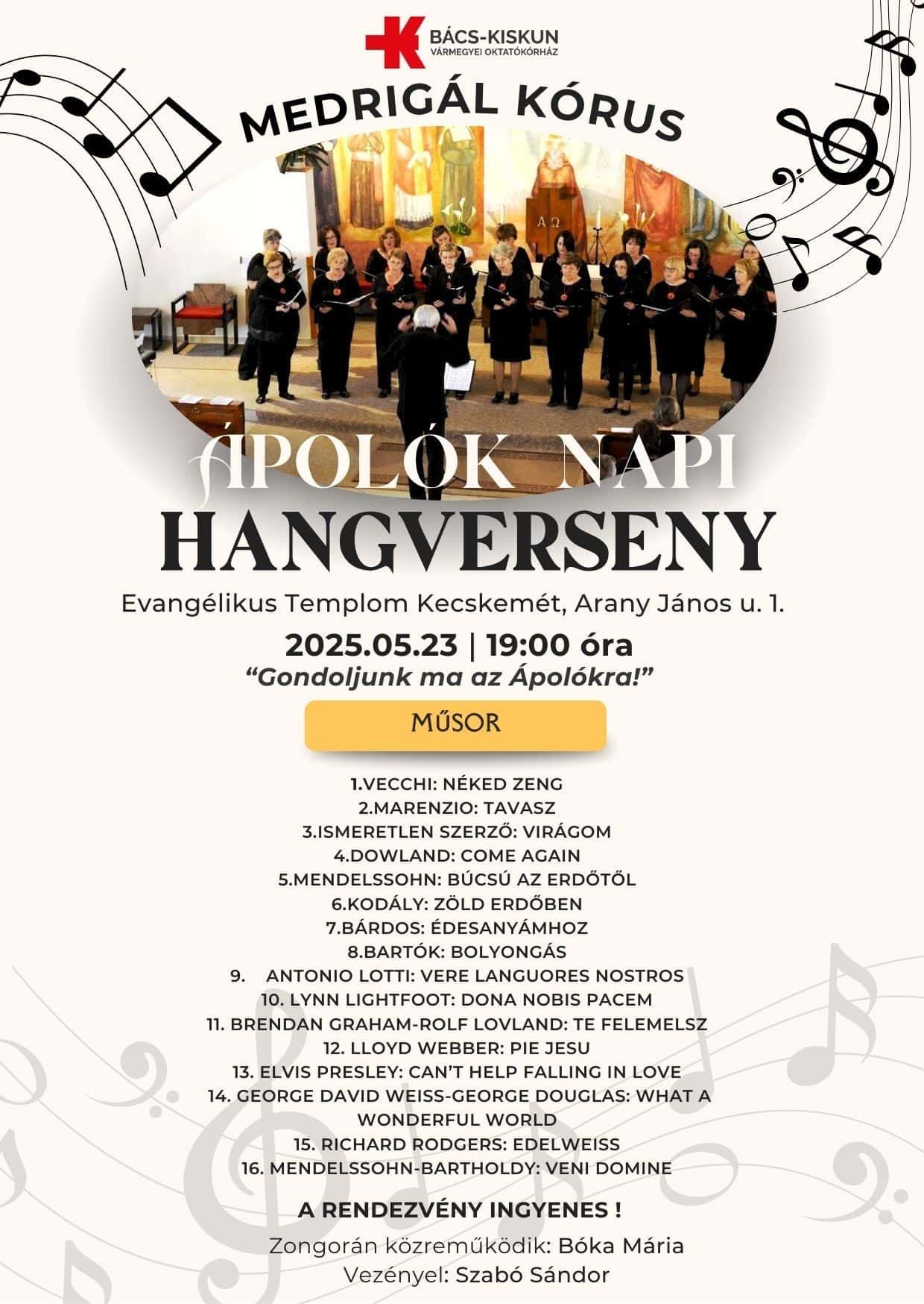 „Gondoljunk ma az ápolókra!” címmel a MEDrigál Kórus ad hangversenyt május 23-án 19 órai kezdettel az evangélikus templomban. Igen változatos műsorra számíthatnak mindazok, akik az ápolók napi ingyenes programra ellátogatnak: Vecchi, Marenzio és Dowland madrigáljai mellett Mendelssohn-, Bárdos-, Bartók- és Kodály-műveket, továbbá kortárs zeneszerzők – például Mary Lynn Lightfoot, Rolf Undsæt Løvland, Andrew Lloyd Webber stb. – darabjait, illetve filmzenéket is énekel majd a megyei kórház Szabó Sándor vezette énekkara, zongorán közreműködik Bóka Mária.