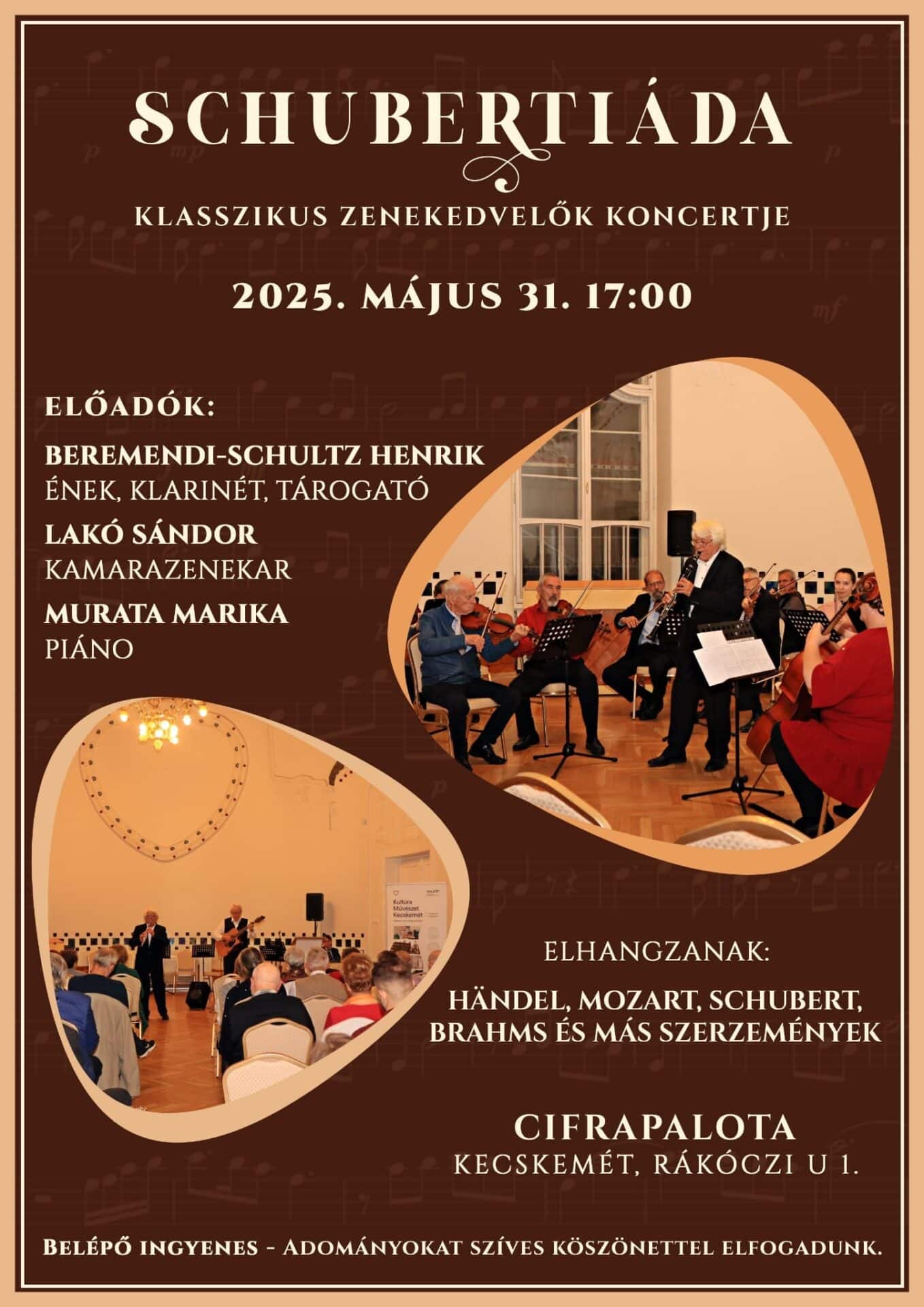 „Schubertiáda – klasszikus zenekedvelők koncertje” címmel rendeznek május 31-én ingyenes programot a Cifrapalotában. A 17 órakor kezdődő hangversenyen Beremendi-Schultz Henrik énekes, tárogatóművész, a Lakó Sándor Kamarazenekar és Murata Marika (zongora) játékát hallhatják majd az érdeklődők, előadásukban más szerzők mellett Händel, Mozart, Schubert és Brahms művei hangzanak el.