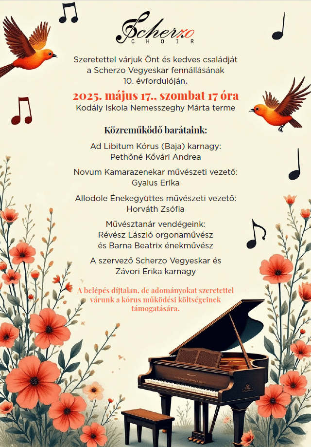 Fennállásának 10. évfordulójára készül a Scherzo Vegyeskar. Ennek megünneplésére egy jubileumi koncertet szerveznek. A Kodály Iskola Nemesszeghy Márta termében május 17-én 17 órakor kezdődő alkalomra az együttes alapító karnagya, Závori Erika ezekkel a gondolatokkal invitálta a zeneszeretőket: „A koncerten – melynek zenei anyagát zenész barátainkkal közösen állítottuk össze – Révész László kiváló orgonista, zongorista, korrepetitor mellett fellép a Novum Kamarazenekar, Horváth Zsófia ének-zenetanár, karvezető, Barna Beatrix énekes művésztanár, a bajai Ad Libitum Kórus és az Allodole Énekegyüttes. Hagyományainkhoz ragaszkodva a hangversenyen a nézők ingyenesen vehetnek részt, de adományokat szeretettel várunk a kórus működési költségeinek támogatására – együttesünk amatőr, önfenntartó, tagjaink között sokan pedagógusok, diákok –, és szeretnénk a velünk rendszeresen együttműködő együtteseknek is egy szerény tiszteletdíjat adni.”