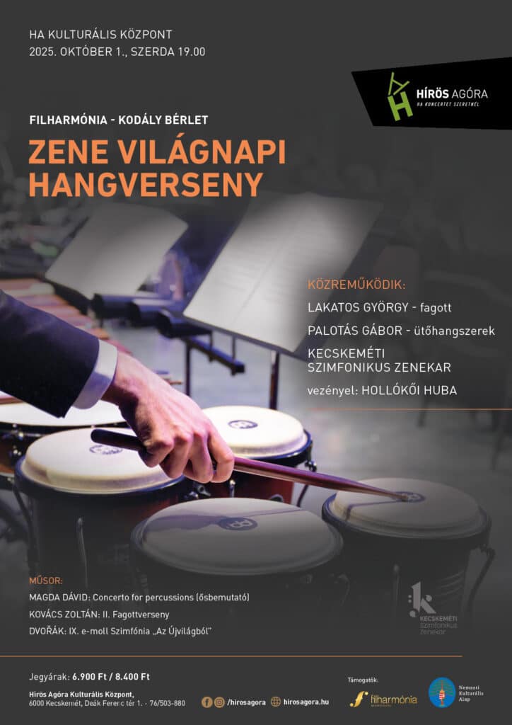 Immár fél évszázada október 1-je a zene világnapja. Minden idők egyik legismertebb hegedűművésze, Yehudi Menuhin javaslatára – aki az ENSZ Nemzetközi Zenei Tanácsában töltött be akkor elnöki tisztet – még 1975-ben jelölte ki az UNESCO ezt a napot az évfordulóra. Ezen a napon a Kecskeméti Szimfonikus Zenekar ünnepi koncertet ad a Hírös Agóra Kulturális és Ifjúsági Központban, a hangverseny egyúttal a Filharmónia Kodály-bérletének első alkalma. Az est egy ősbemutatóval indul: Magda Dávid Concerto for percussions műve a ritmusok és az ütőhangszerek sokszínű világát tárja fel. A kifejezetten a kecskeméti szimfonikusoknak és az együttes ütőhangszeres művészének, Palotás Gábornak írt kompozíció energikus, vadonatúj zenei élményt ígér. Ezt követően a fagott kerül a középpontba. Kovács Zoltán II. fagottversenyében a hangszer mély, bársonyos tónusa és virtuóz adottságai bontakoznak ki egy modern, mégis dallamgazdag alkotás keretei között – a darab szólistája Lakatos György fagottművész lesz. Az est zárásaként Antonín Dvořák legnépszerűbb zenekari darabja, a IX. (e-moll) szimfónia csendül majd fel.