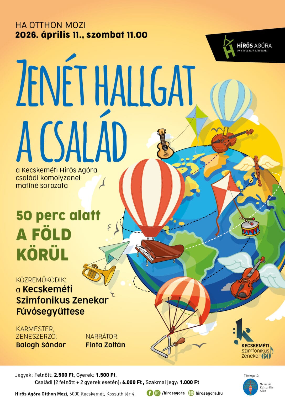 Az alapításának 60. évfordulóját március utolsó napjaiban nagyszabású jubileumi koncerttel ünneplő Kecskeméti Szimfonikus Zenekarnak áprilisban két programja lesz. 11-én a Hírös Agóra komolyzenei matinésorozata, a Zenét hallgat a család újabb alkalmán mesés utazásra várják a gyermekeket és szüleiket. A szimfonikusok fúvósegyüttese az 50 perc alatt a Föld körül címmel meghirdetett program során Balogh Sándor harsonaművész, a Zeneakadémia Fúvós Tanszékének oktatója zenéjét szólaltatja majd meg a szerző vezényletével. Az Otthon Moziban 11 órakor kezdődő program narrátora Finta Zoltán lesz. A zenekar – immár Hollókői Huba irányításával – április 20-án is színpadra lép. A Hírös Agóra színháztermében egy szép hagyomány folytatásának lehetnek tanúi a zeneszeretők: ismét koncertlehetőséget kapnak a Kecskeméti Kodály Iskola kimagasló tehetségű növendékei. A Fiatal virtuózok című hangversenyen Tóth Emma (gitár), Prezsmer Flóra (ének), Kiss Hanna Petra (fuvola), Kapitány Áron (zongora) és Rain Yang Yuxuan (zongora) áll a közönség elé a kecskeméti szimfonikusok partnereként.