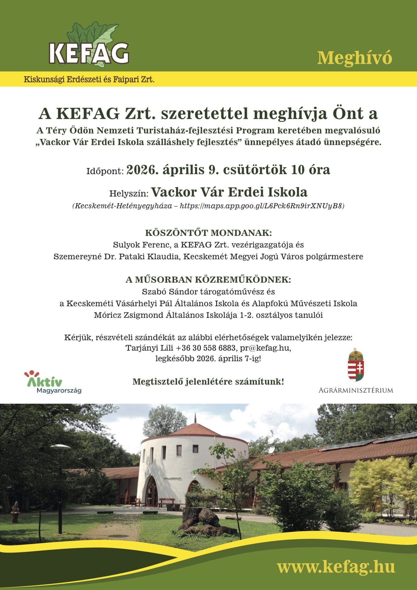 2026. április 9. – 10.00 óra – Vackor Vár Erdei Iskola – Az erdei iskola szálláshelyfejlesztésének átadóünnepsége