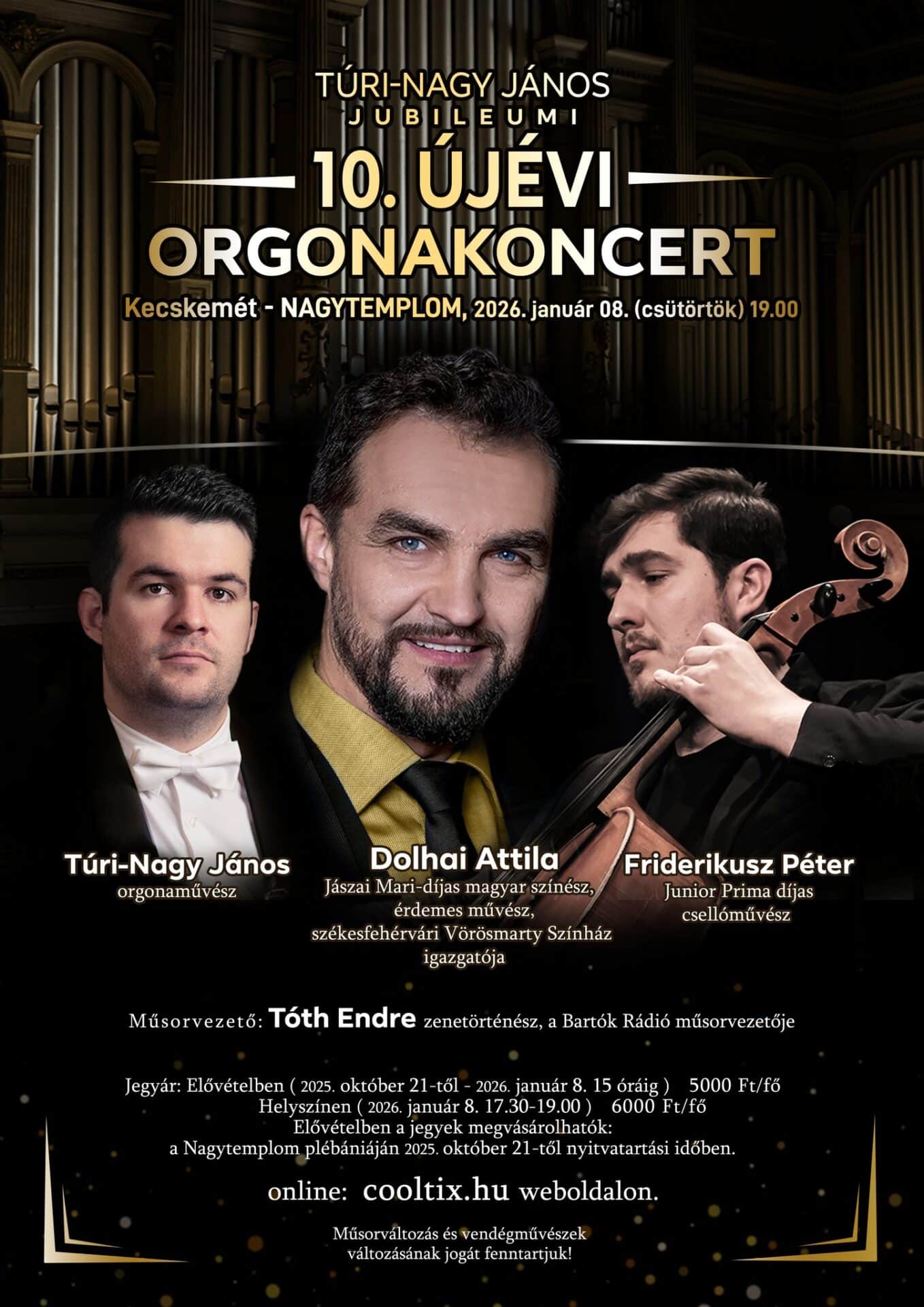 Szintén január 8-án immár 10. alkalommal rendez a Nagytemplomban újévi orgonaestet Túri-Nagy János orgonaművész. A jubileumi koncerten elhangzó művek kiválasztásáról a Kecskeméti Kodály Iskola korábbi diákja elmondta: „A műsort illetően idén is a sokszínűségre törekedtem, hogy minden kedves hallgató megtalálja a számára legkedvesebb műfajt, műveket, zeneszerzőket.” A 19 órakor kezdődő programon az elmúlt évekhez hasonlóan neves előadóművészek működnek közre: ezúttal a székesfehérvári Vörösmarty Színház munkáját 2025 óta irányító Jászai Mari-díjas színész, érdemes művész, Dolhai Attila, valamint a néhány hónappal ezelőtt Junior Prima díjjal jutalmazott ifjú tehetség, a tanulmányainak egy részét szintén Kecskeméten végző csellóművész, Friderikusz Péter közös produkciójában gyönyörködhetnek majd az érdeklődők. A hangverseny meglepetést is tartogat: „A fellépők között lesz Dolhai Luca klasszikus énekművész is, aki apukájával duettezni is fog ezen az estén” – árulta el Túri-Nagy János, a budapesti Operettszínház korrepetitora. A darabok közötti szünetekben Tóth Endre zenetörténész, a Bartók Rádió műsorvezetője oszt meg háttér-információkat, érdekességeket a felhangzó zeneművekről. A hangversenyre – melynek részesei feltehetően idén is felejthetetlen élménnyel gazdagodnak majd – jegyek elővételben kaphatók a cooltix weboldalán, valamint a Kecskeméti Római Katolikus Főplébánián nyitvatartási időben.