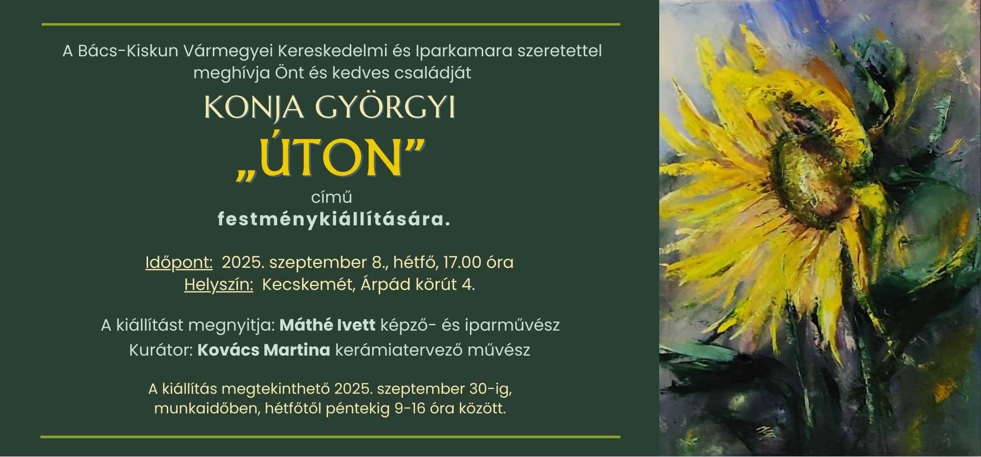 Hétfőn 17 órakor nyitja meg Máthé Ivett képző- és iparművész Konja Györgyi festőművész képeinek tárlatát a Bács-Kiskun Vármegyei Kereskedelmi és Iparkamara kecskeméti székházában. Az „Úton" című című összeállításban a művésznő legújabb munkái kerülnek bemutatásra, amelyek a belső és külső utazás, az elmozdulás, a keresés és a megtalálás témáit járják körül. A kamara 2008 óta több mint száz alkalommal adott helyet művészek bemutatkozására. A jubileumi rendezvényt az idén februárban nyitották meg, akkor a IX. AXON Kecskeméti Művésztelep tárlatát nézhették meg az érdeklődők.