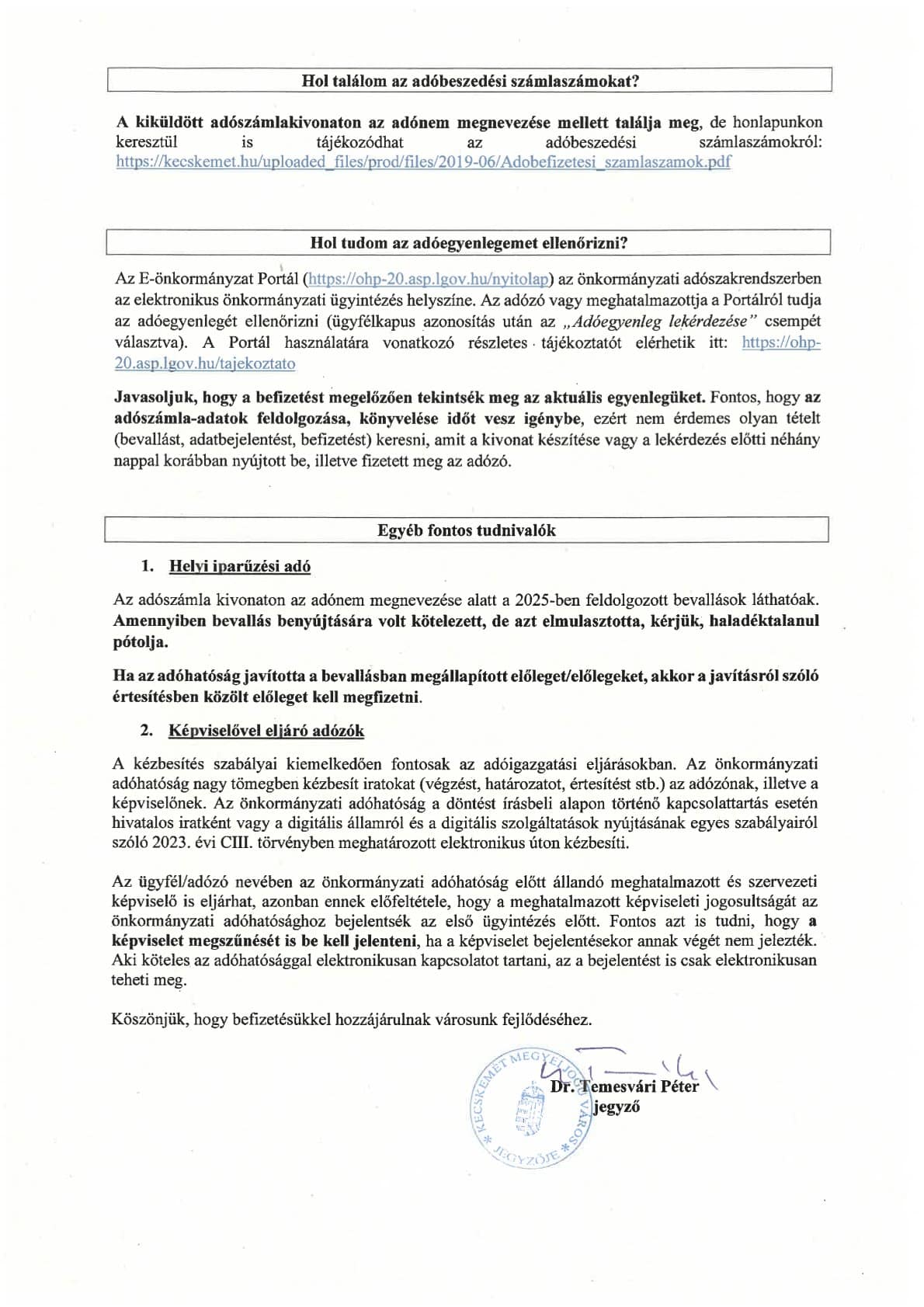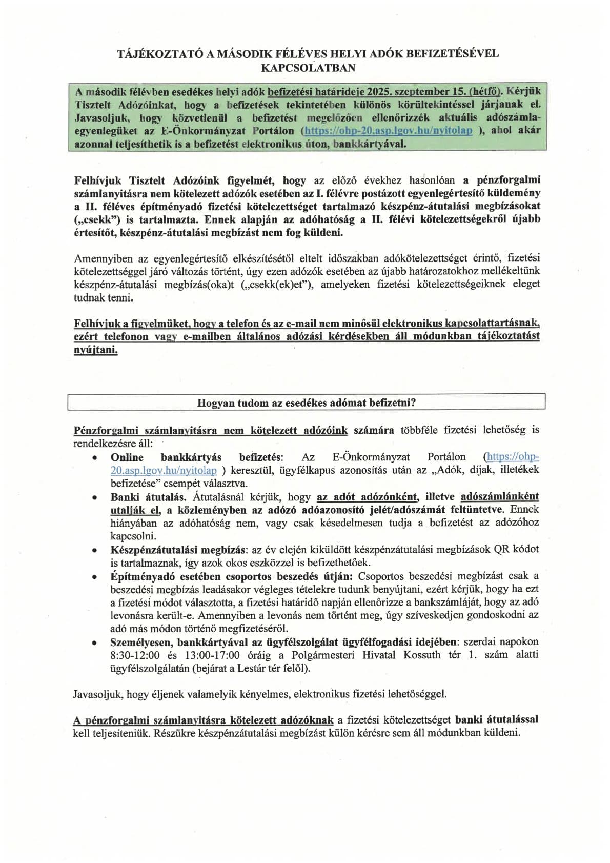 Közeledik a helyi adók befizetésének határidejeKÖZLEMÉNY2025. 09. 04., 14:45Tájékoztatóban hívja fel az érintettek figyelmét a helyi adók befizetésének közelgő határidejére a polgármesteri hivatal. Mutatjuk a tudnivalókat: #befizetés #helyi adók #Kecskemét #második félév #polgármesteri hivatal