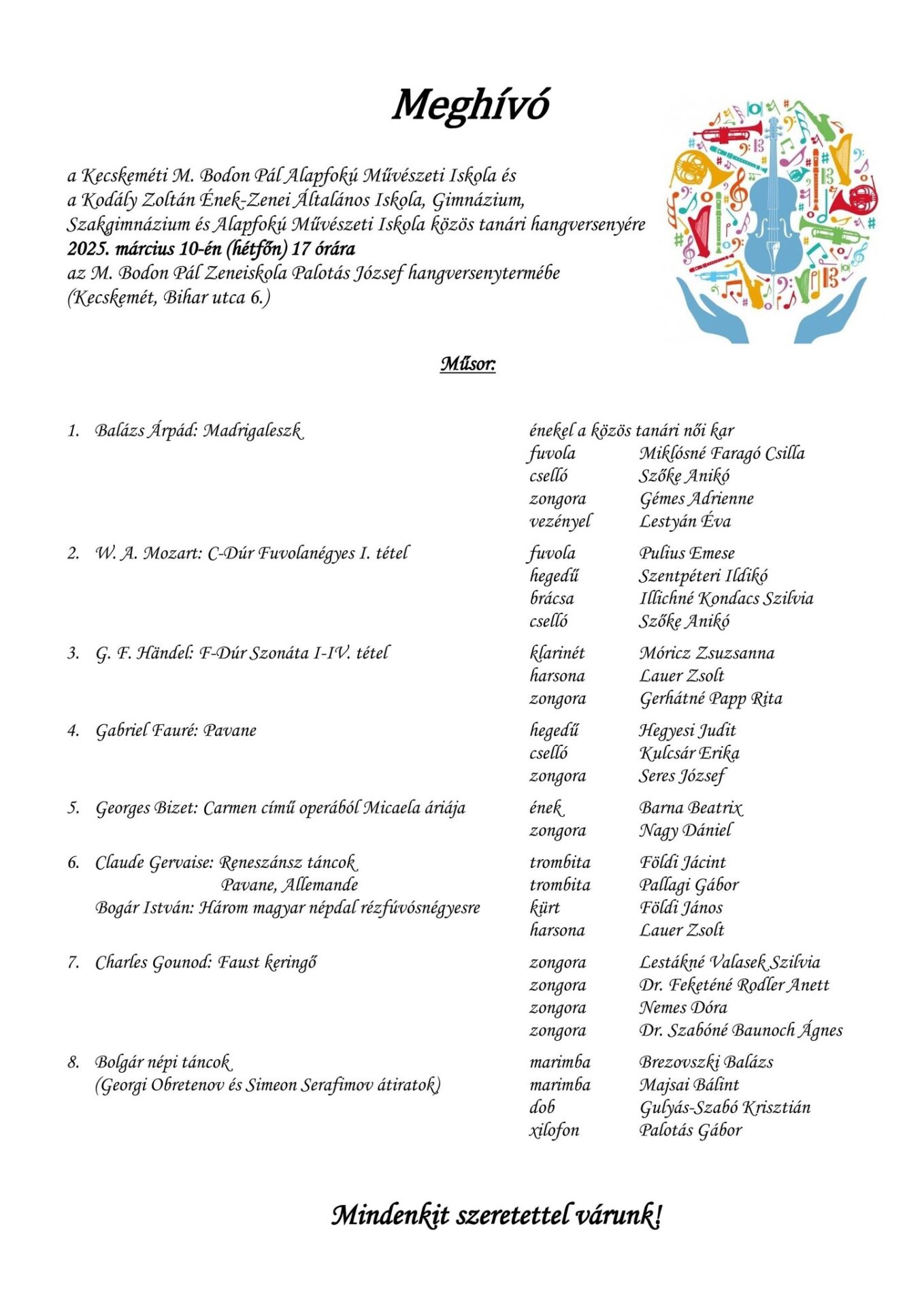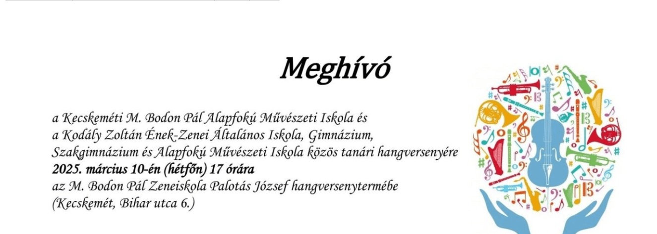 Az M. Bodon Pál Zeneiskola és a Kecskeméti Kodály Iskola hagyományos közös tanári hangversenyét 2025. március 10-én, hétfőn rendezik meg. Az igen érdekesnek ígérkező műsorban – többek között – a két intézmény négy ütőtanára: Brezovszki Balázs, Gulyás-Szabó Krisztián, Majsai Bálint és Palotás Gábor is játszik majd egy közös produkciót.