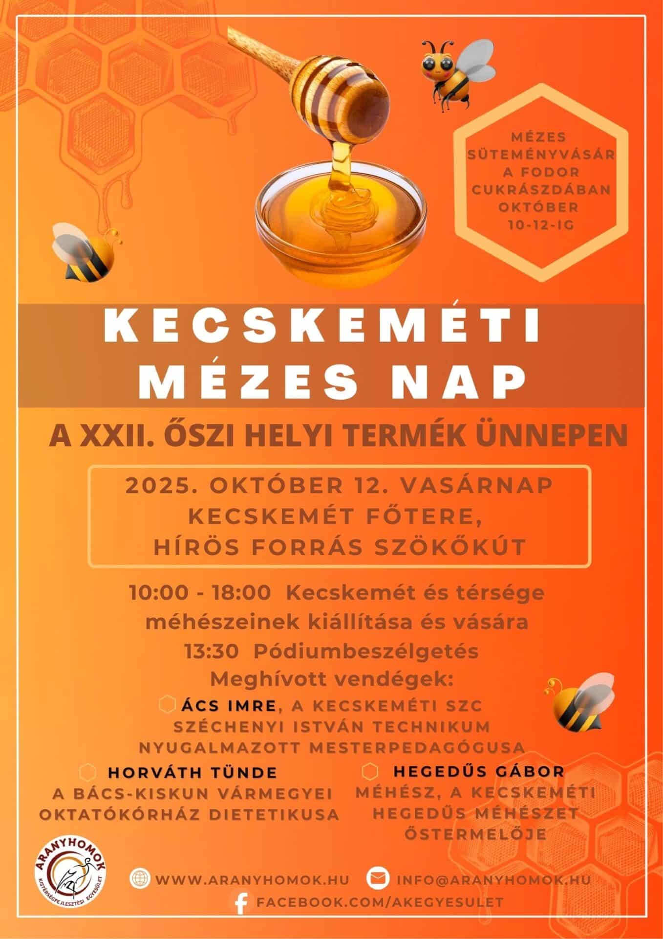 Az idei év újdonsága a Kecskeméti Mézes Nap (vasárnap), amelyen a térség méhészei mutatkoznak be kiállítással és vásárral. A pódiumbeszélgetés során szakemberek osztják meg a méz gyógyhatásait, betekintést nyújtanak a méhészet világába, és megmutatják, hogyan válik a méz a gasztronómia különleges alapanyagává. A programhoz csatlakozik a Fodor Cukrászda is, amely mézes sütemény vásárral várja a vendégeket Szabadság téri üzletében.