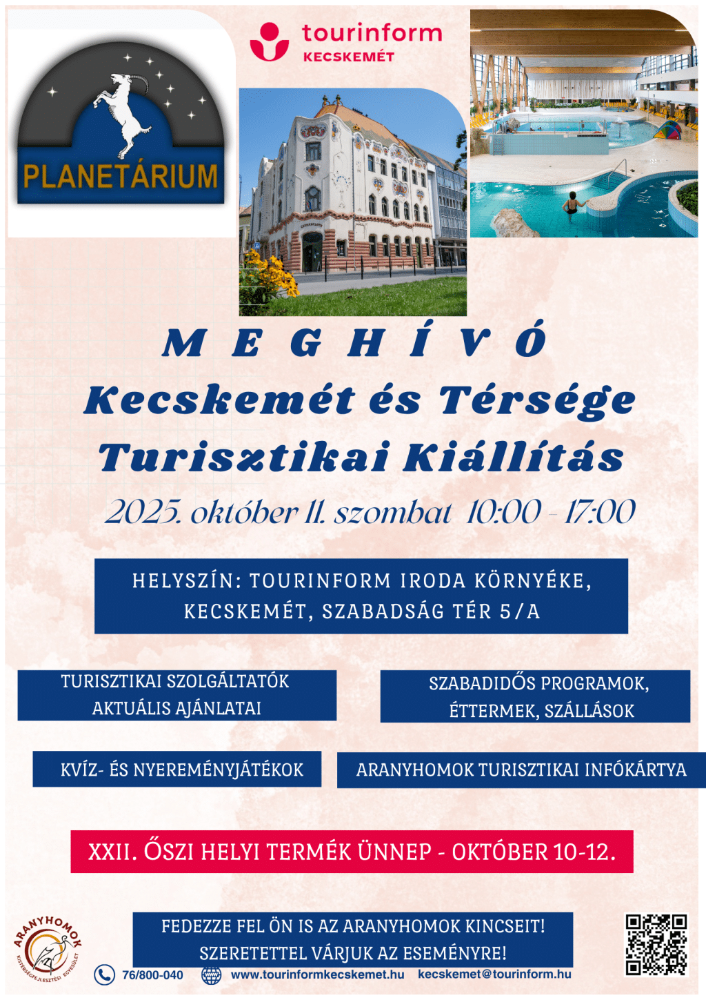 Október 11-én szombaton IV. Kecskemét és Térsége Turisztikai Kiállításra invitál az Aranyhomok Egyesület 10 – 17 óra között a Tourinform Iroda környékén, a Kecskemét Tourinform Iroda üzemeltetője. Az esemény célja, hogy az érdeklődők megismerjék Kecskemét és térsége szolgáltatóit, éttermeit, szálláshelyeit és szabadidős programkínálatait, valamint hozzájáruljon a térség turizmusának fellendítéséhez. Izgalmas kvízek és nyereményjátékok színesítik a programot, amely kapcsolódik a XXII. Őszi Helyi Termék Ünnep eseményhez.