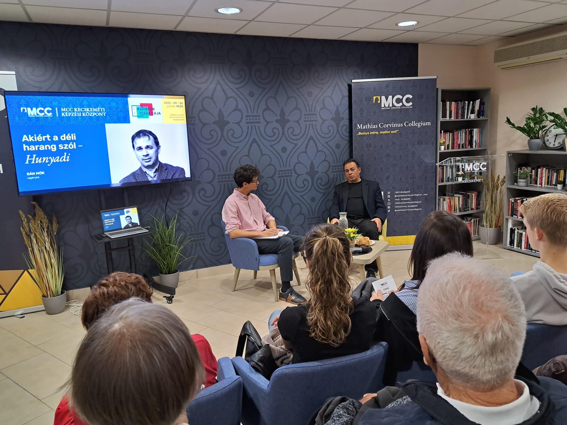 A Mathias Corvinus Collegium (MCC) kecskeméti központjának Kodály-terme megtelt péntek este a Bán Mórral (polgári nevén Bán Jánossal, Kecskemét alpolgármesterével) való beszélgetésre. A téma természetesen nem is lehetett más, mint a népszerű Hunyadi-sorozat, könyvben és a filmvásznon. Az est a Kutatók Éjszakája programjai közé illeszkedett, hiszen egy történelmi regényfolyam megírása komoly kutatómunkát igényel – Bán Mór erről is mesélt többek között.