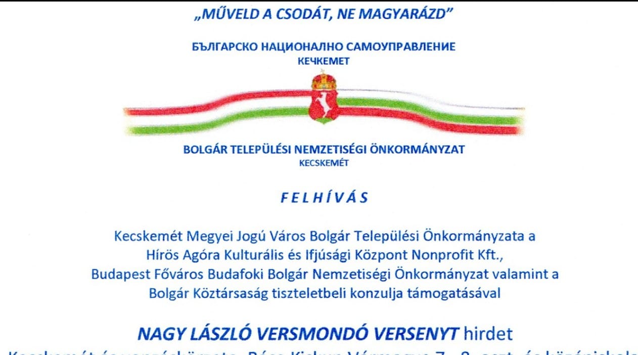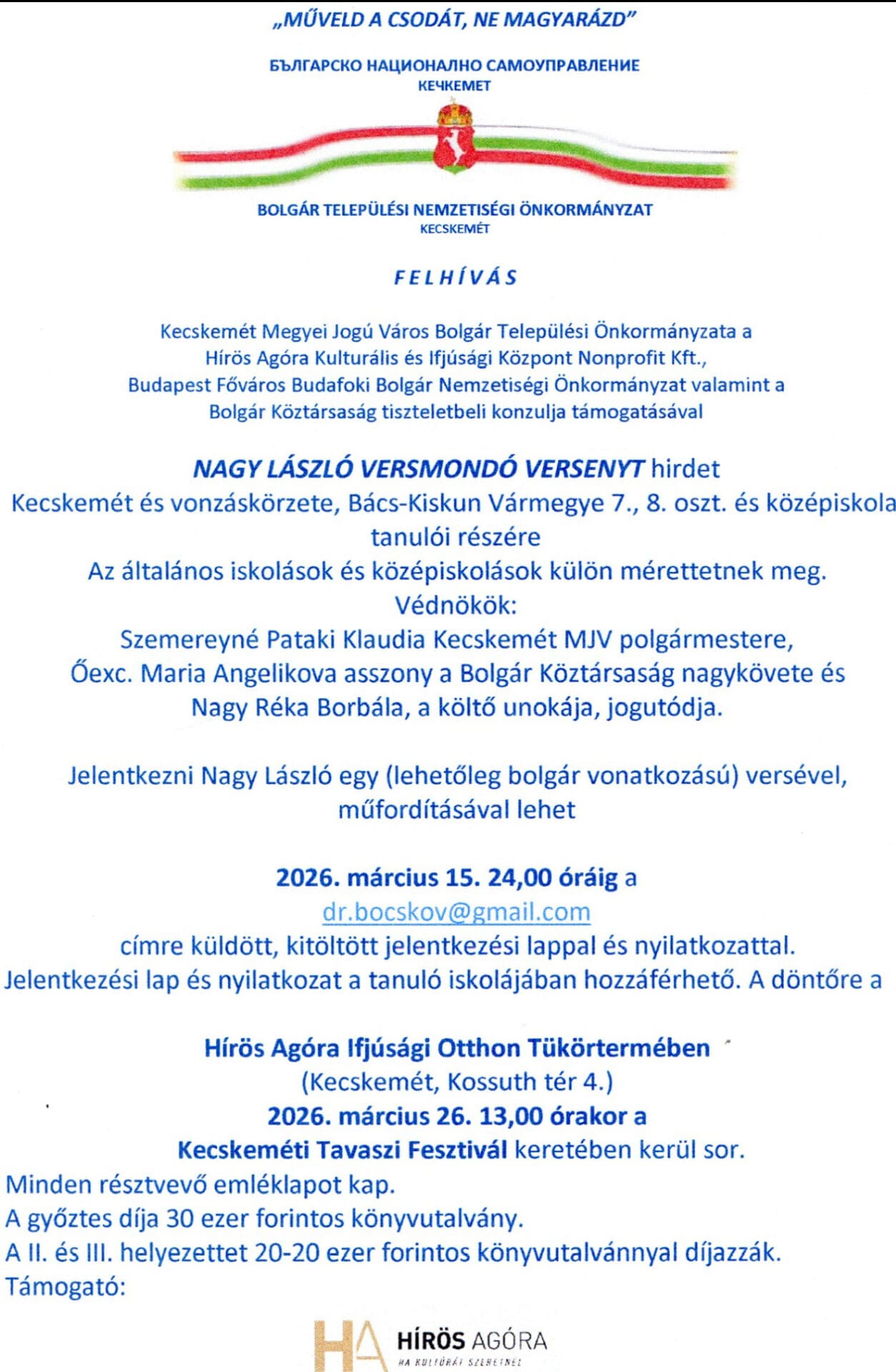 Már lehet jelentkezni a Nagy László versmondó versenyreKÖZLEMÉNY2026. 03. 06., 12:38Negyedik alkalommal hirdeti meg a Nagy László versmondó versenyt Kecskeméten a Bolgár Települési Nemzetiségi Önkormányzat. Mutatjuk a részleteket. #Bolgár Települési Nemzetiségi Önkormányzat #jelentkezni #Kecskemét #Nagy László #versmondó