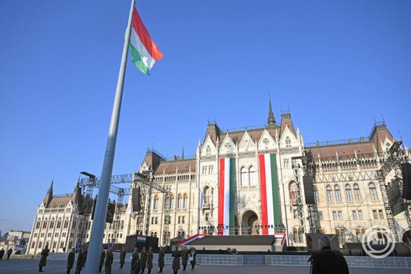 Budapest, 2026. március 15. Katonai tiszteletadás mellett felvonják a nemzeti lobogót az 1848-49-es forradalom és szabadságharc 178. évfordulóján az Országház előtti Kossuth Lajos téren 2026. március 15-én. MTI/Bruzák Noémi