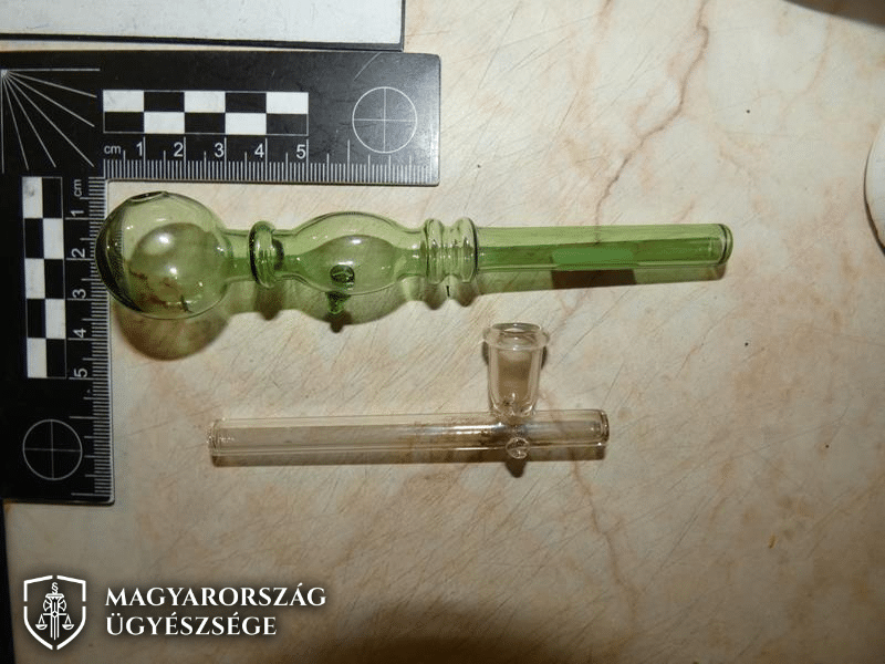 (A csatolt, a rendőrség által a helyszíni szemle során készített fényképeken a nőtől lefoglalt, az új pszichoaktív anyag fogyasztásához használt pipa és az alufóliába csomagolt anyag látható.)
