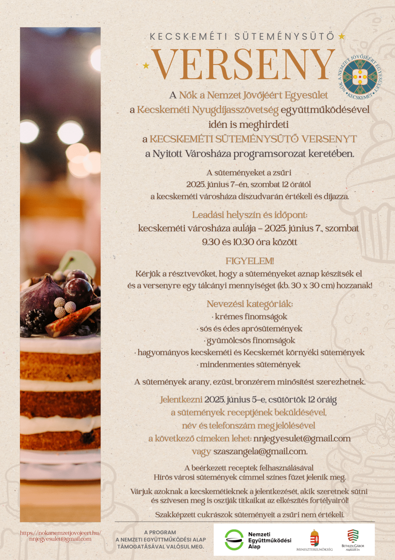 Jelentkezni 2025. június 5-e, csütörtök 12 óráig a sütemények receptjének beküldésével, név és telefonszám megjelölésével a következő címeken lehet: [email protected] vagy [email protected].
