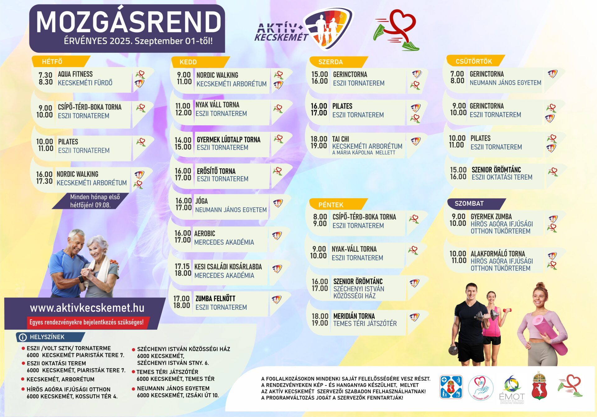 A részletes órarend, helyszínek és jelentkezési információk megtalálhatók a www.aktivkecskemet.hu oldalon. Érdemes folyamatosan figyelni a honlapot, mert további új helyszínekkel és új mozgási lehetőségekkel bővül hamarosan a kecskeméti kínálat.