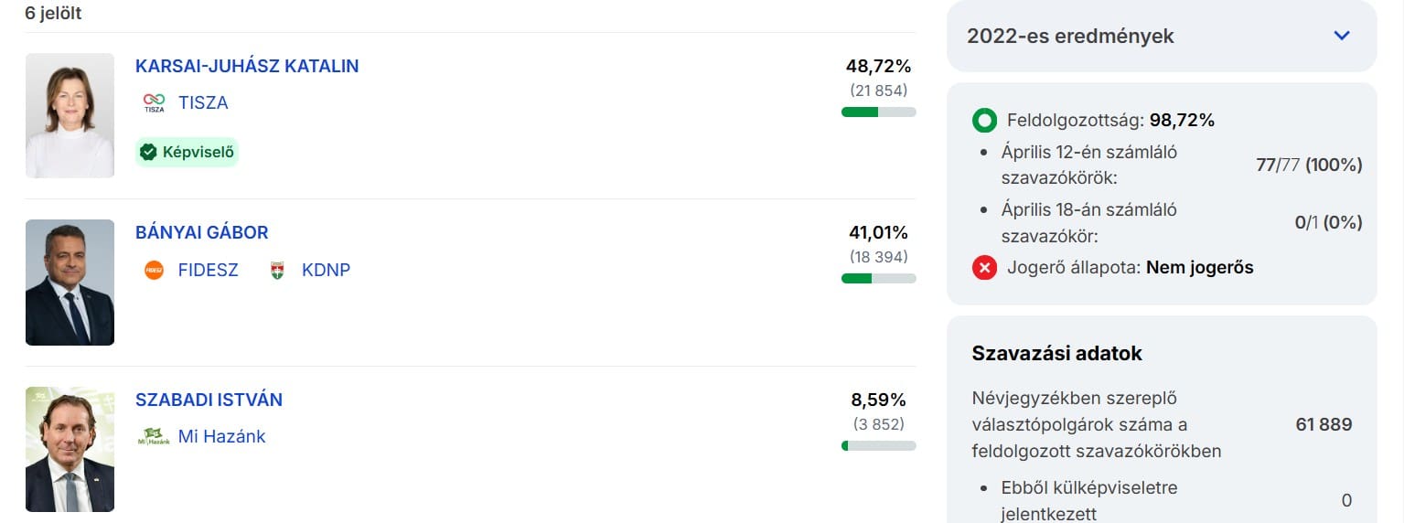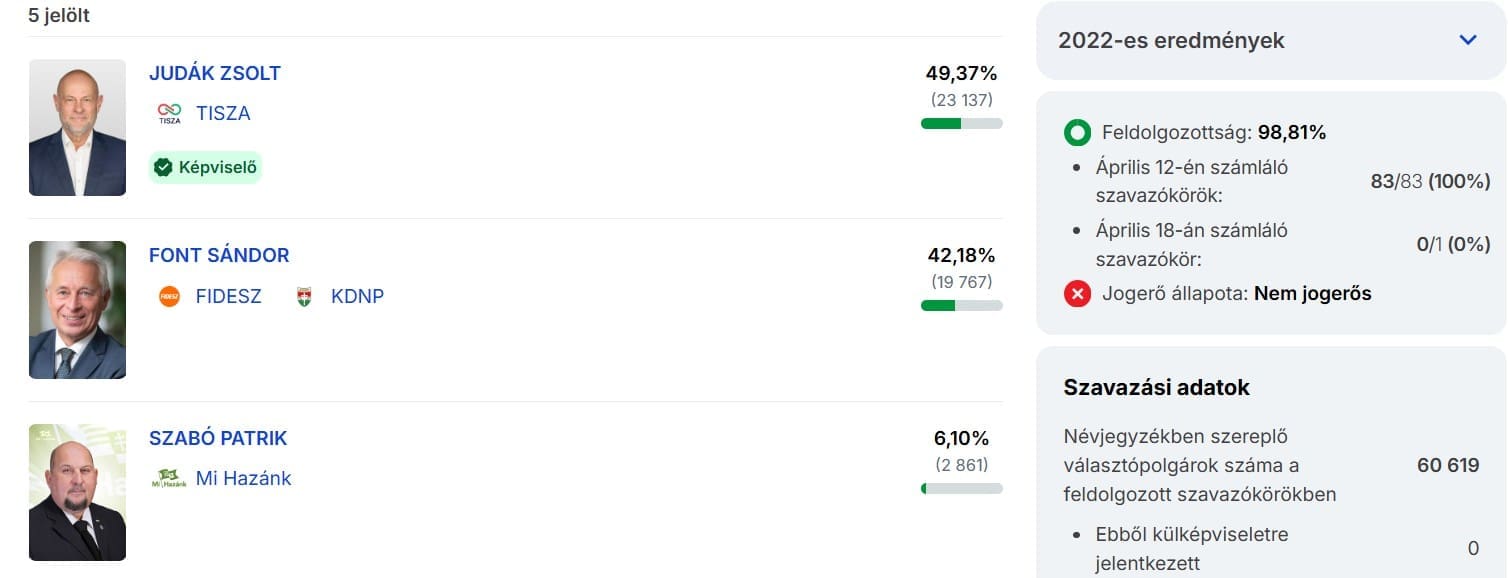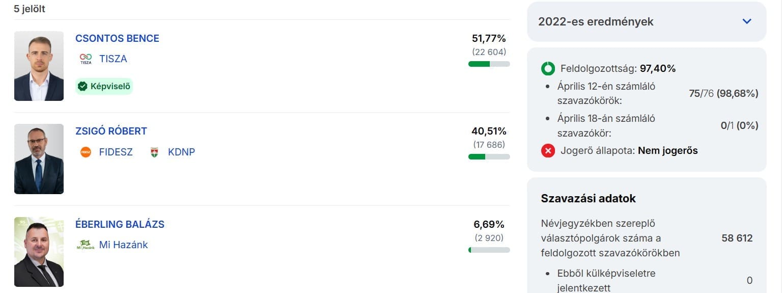 Csőszi Attila 51,38 százalékkal nyert, megelőzve dr. Salacz Lászlót (40,68 százalék) - Bács-Kiskun 02. számú választókerület 95,18%-os feldolgozottság alapján:
