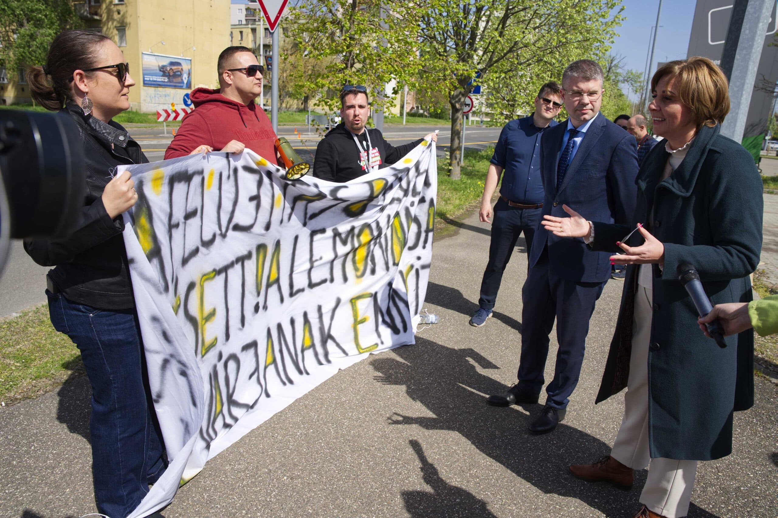 A felüljáró túloldalán mindeközben bőszen dolgoztak a gépek. A hangoskodóknak sikerült megzavarnia a felszólalókat, az államtitkár véletlenül Celldömölköt mondott Kecskemét helyett.