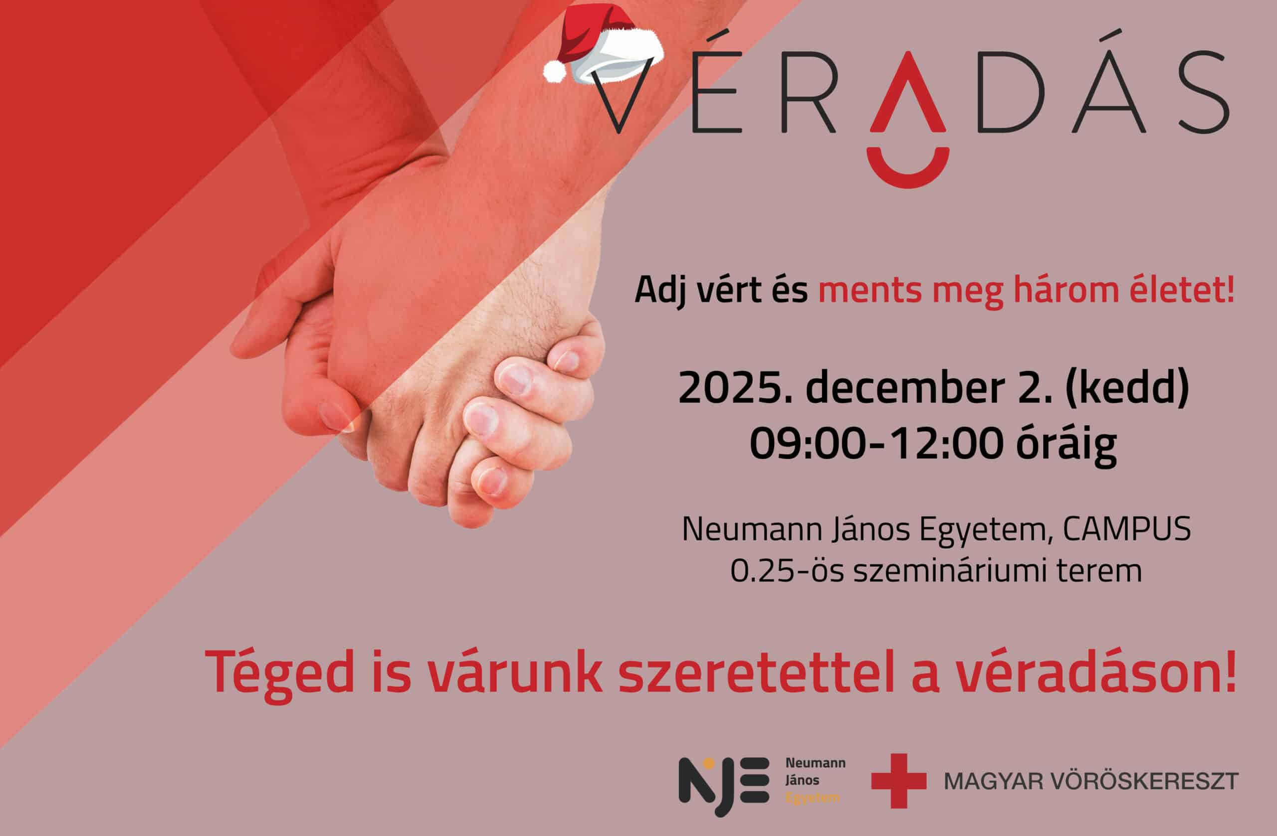 A véradásra december 2-án 9 – 12 óra között nyílik lehetőség a CAMPUS Oktatási Épületében a, földszint 0.25-ös szemináriumi teremben. (6000 Kecskemét, Izsáki út 5.)