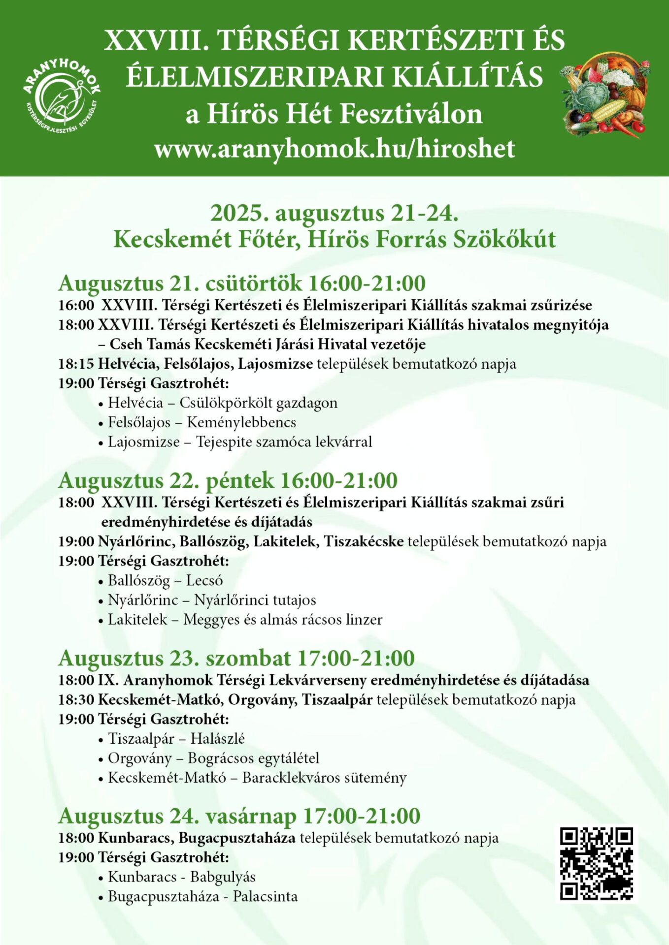 Kecskemét egyik legnagyobb fesztiváli rendezvényének a keretében szervezik meg a XXVIII. Térségi Kertészeti és Élelmiszeripari Kiállítást. A 12 térségi település részvételével megvalósuló rendezvény több mint 130 kiállítót vonultat fel, bemutatva a helyi mezőgazdaság, élelmiszeripar, dísznövénykertészet, kézművesség, népi kultúra és hagyományőrzés legszebb, legértékesebb arcát augusztus 21-24.között.