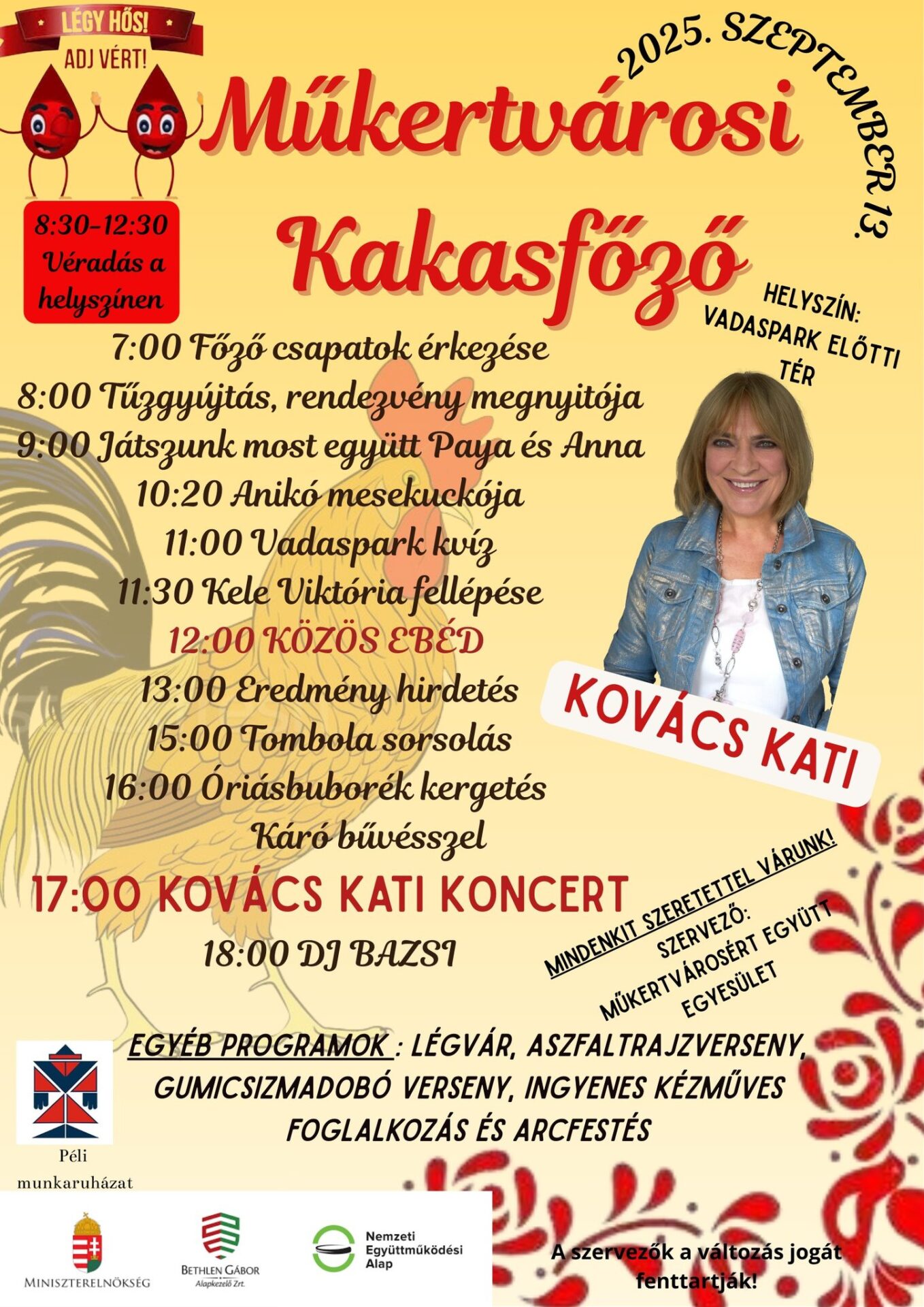 Közös ebéddel összekötött kakasfőzést rendez a Műkertvárosért Egyesület a Vadaspark előtti téren szeptember 13-án, szombaton. A rendezvény sztárvendége Kovács Kati énekesnő lesz.