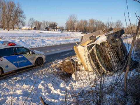 Viharos erejű szél, csúszós út és hóátfúvások vezettek közlekedési balesethez Kiskunhalas határában. Az 5412-es úton egy ponyvás kisteherautó az árokba borult, a sofőrt kórházba szállították, a térségben több helyen is veszélyes útviszonyok nehezítik a közlekedést.