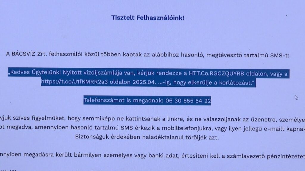Megtévesztő tartalmú SMS-t kaptak többen, amit a BÁCSVÍZ Zrt. nevében küldtek az érintetteknek. A BÁCSVÍZ Zrt. tájékoztatta az ügyfeleit, hogy semmiképp ne kattintsanak a linkre és ne válaszoljanak az üzenetre személyes adatot megadva.
