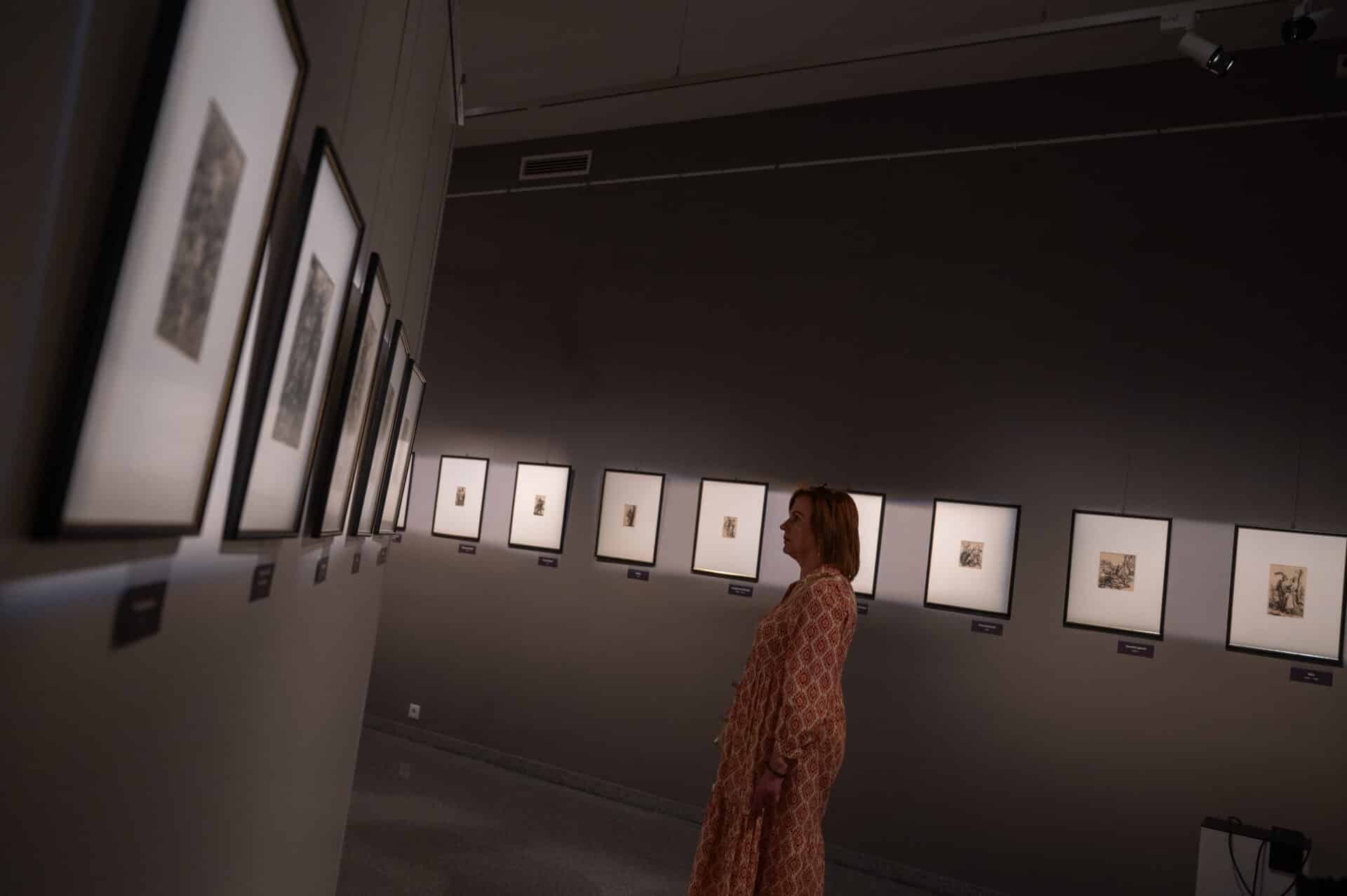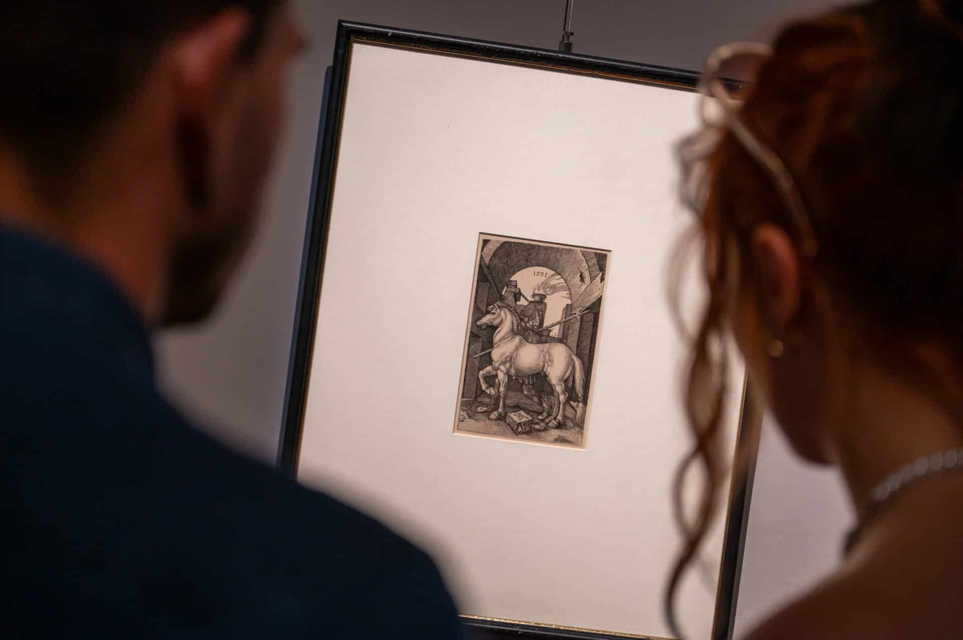 Az egyből ezután következő második tárlatvezetésen a Bozsó másik időszaki tárlatát, Albrecht Dürer metszeteit ismerhették meg az érdeklődők, ugyancsak Loránd Klára kalauzolásával. A Thomas Emmerling magángyűjteményéből válogató kiállítási anyagban olyan művek szerepelnek, amelyek Dürer nyomatainak 19. századi másolataival készültek, tehát szigorúan véve nem eredetiek, mégis pontos másai a nagy nürnbergi mester alkotásainak. A rövid tárlatvezetés csak néhány kiemelt metszet bemutatására szorítkozhatott: terítékre került többek között az egyből a bejáratnál található híres Ádám és Éva, a belsőbb termek egyikében látható Melankólia, valamint A lovag, a halál és az ördög is. Dürer metszeteinek részletgazdagsága és elképesztő művészi kifejezőereje mindenképpen megérdemli, hogy egy alkalommal alaposabban is végignézzük a kiállítást.