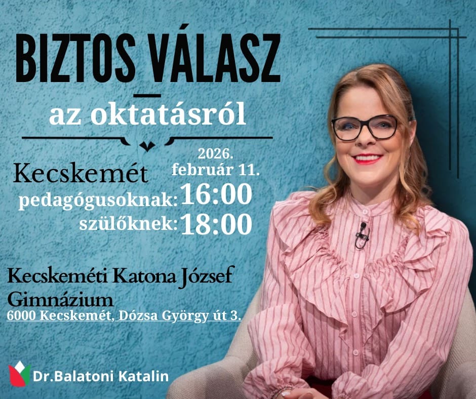 Dr. Balatoni Katalin miniszterelnöki biztos asszony 2026. február 11-én fórumot tart Kecskeméten a köznevelést érintő témakörökben.